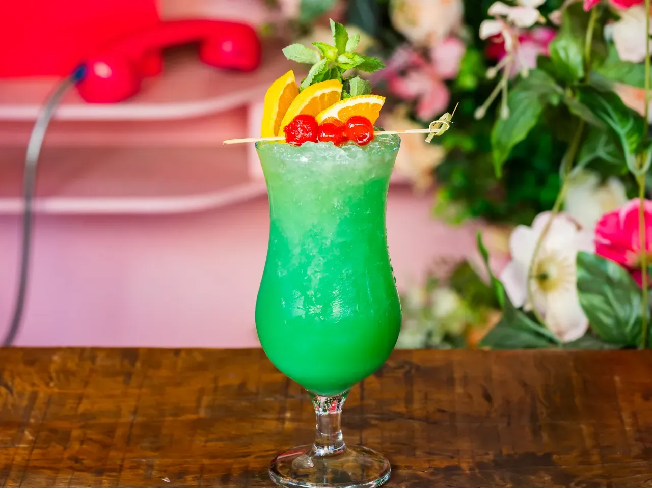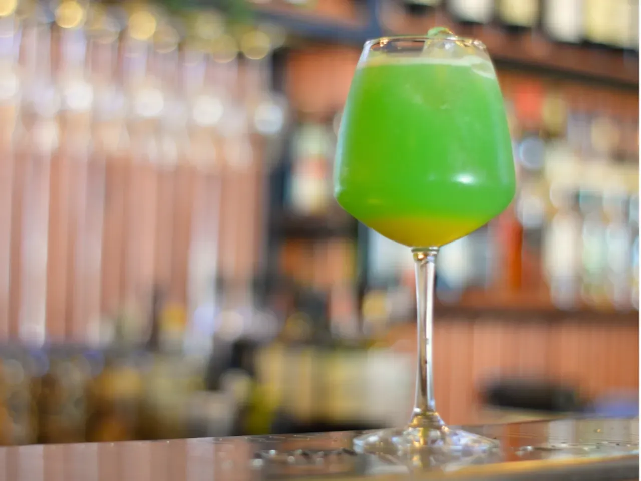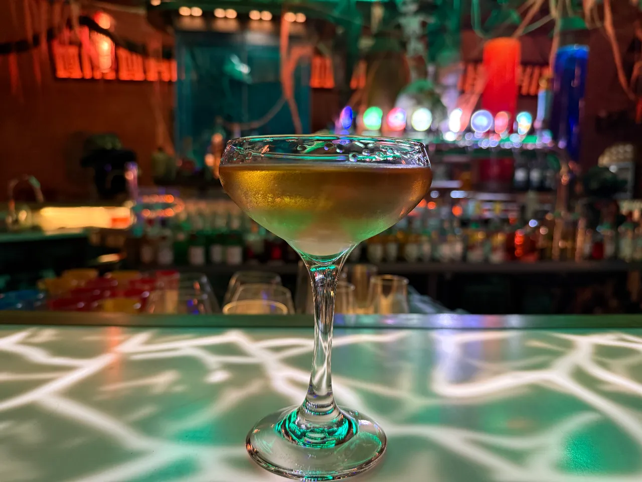 Cóctel a base de gin Tanqueray london dry , dom benedictine, syrup de kiwi , zumo de pomelo perfumado con un licor de hierbas.