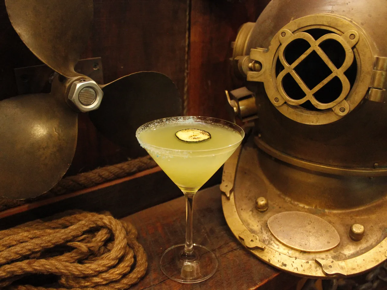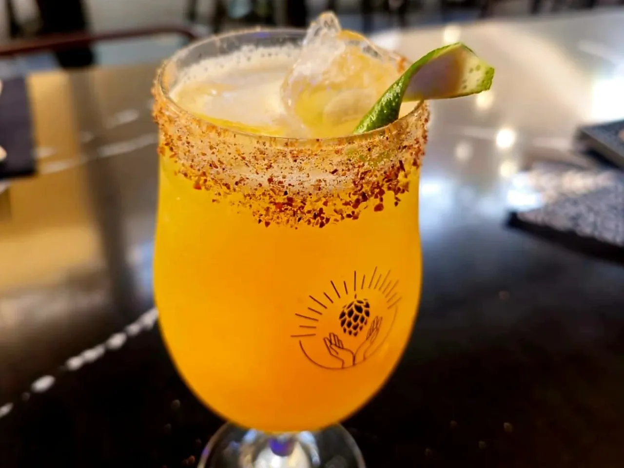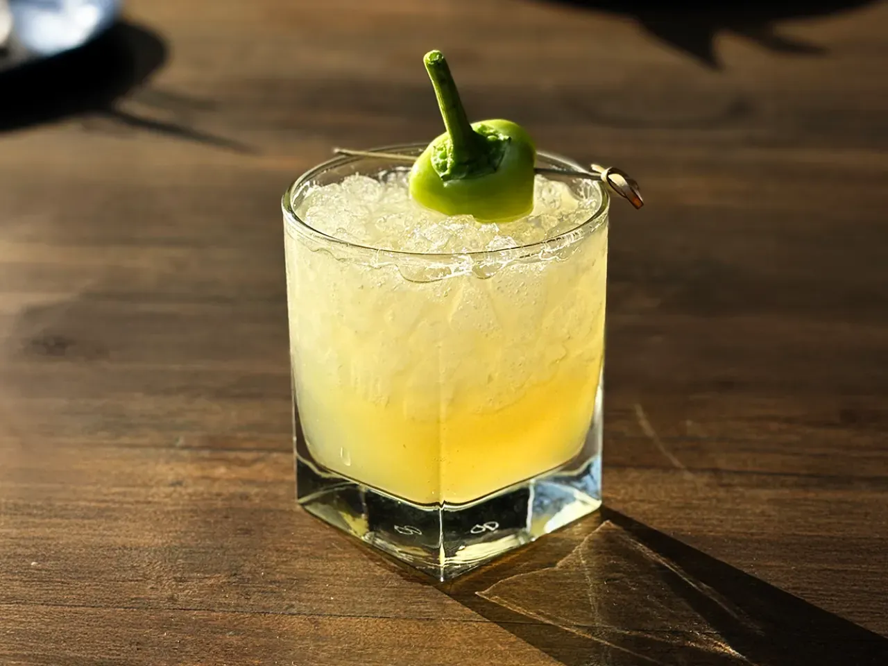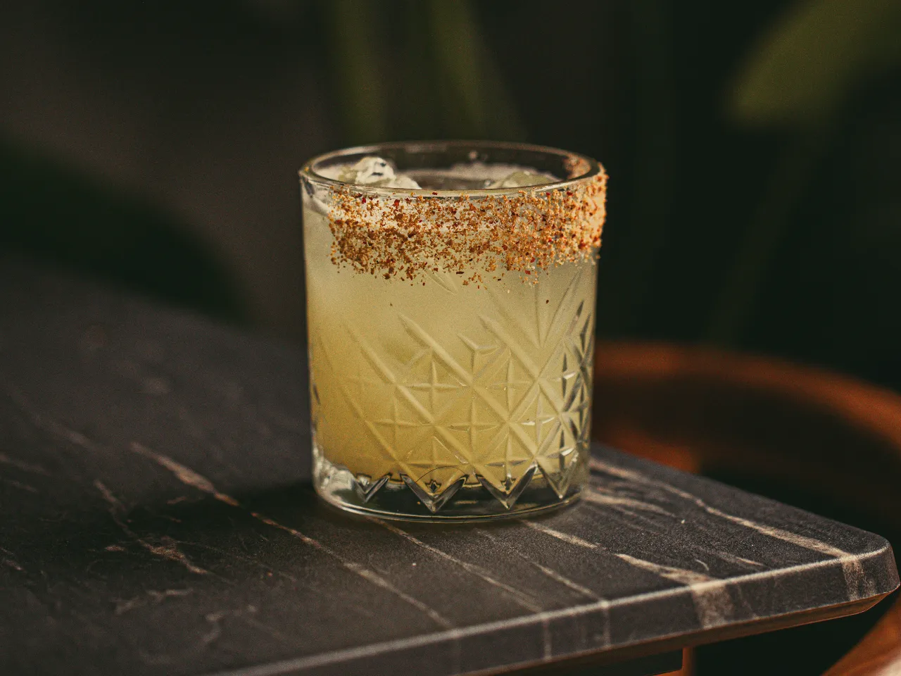 Tequila Olmeca Reposado, Zumo de Pomelo, Zumo de limón sutil, syrup de miel jengibre y ají verde, solución Salina y salmerken