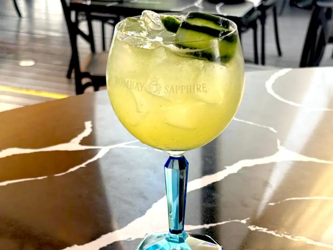 Gin Bombay Sapphire, zumo de limón, dash de maracuyá, slices de pepino, syrup simple y Redbull Yellow.