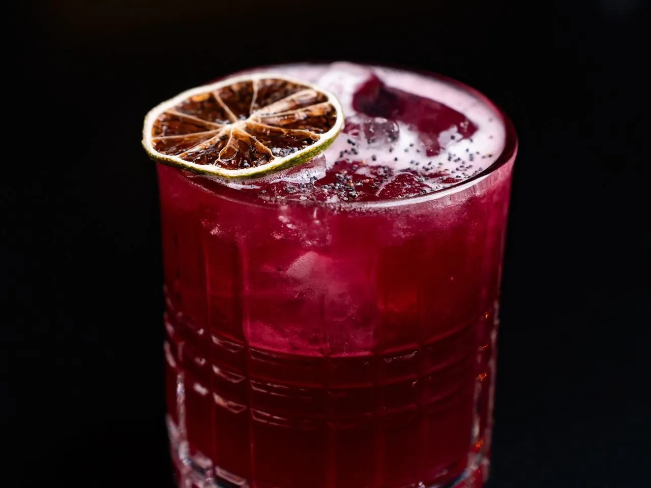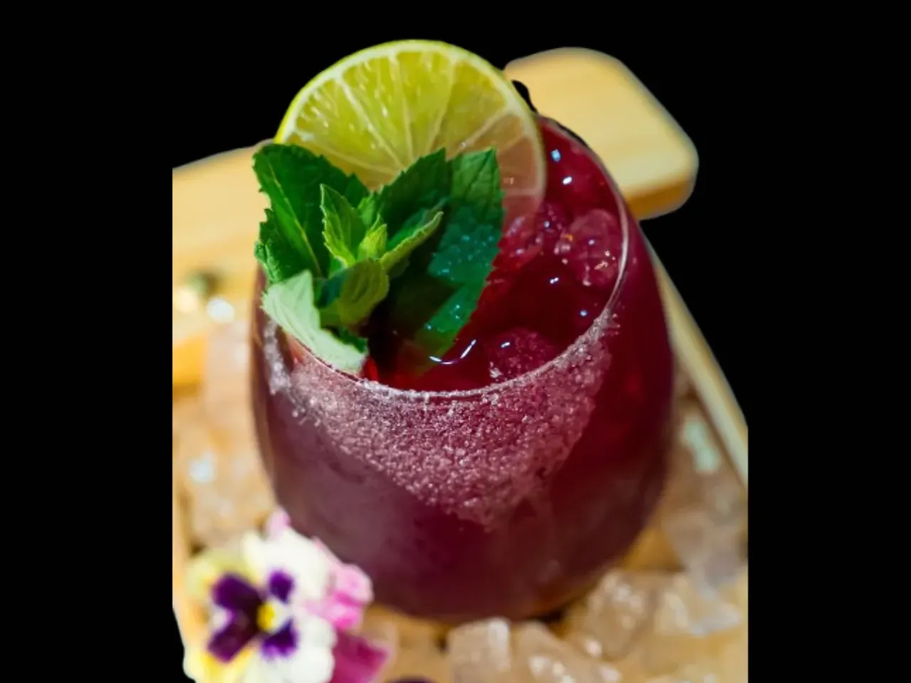Mezcal San Cosme, agua de jamaica, agave picante, limón y sal negra de hibiscus