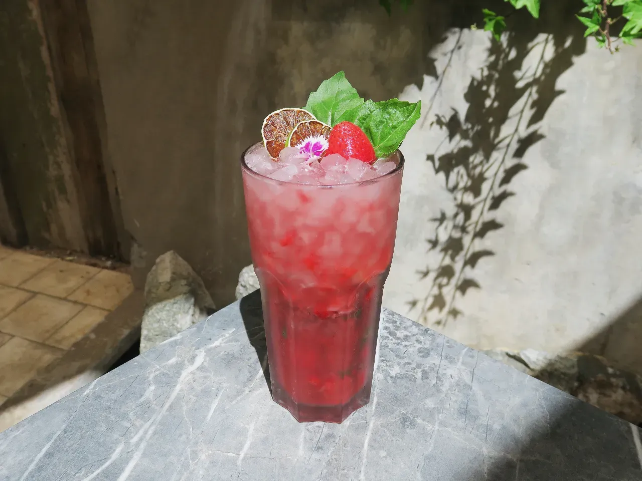 Pisco quebranta, zumo de maracuyá, menta, frutilla, agua con gas acompañado de syrup