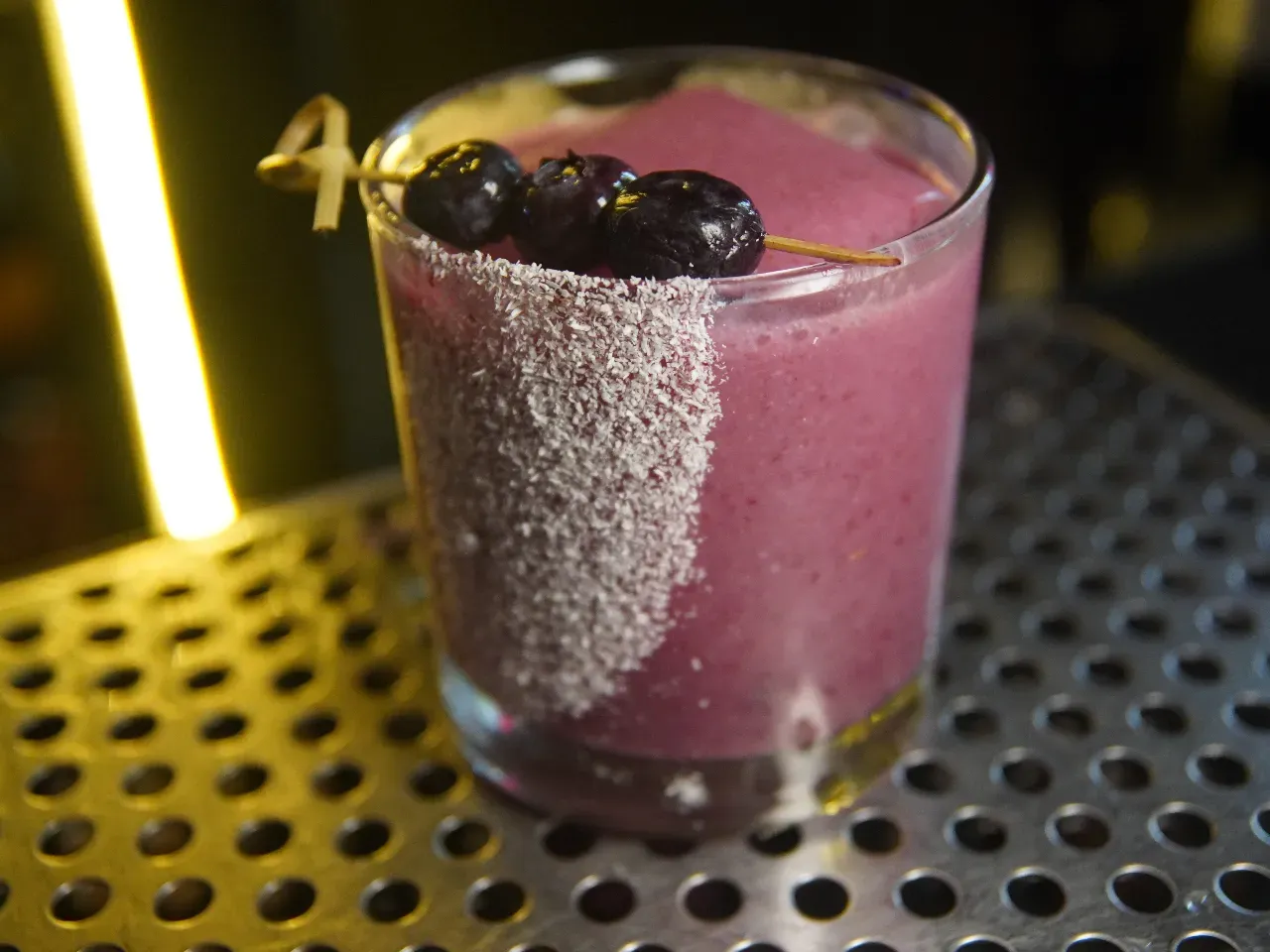 Sake, Ron macerado, Jugo de pomelo, Crema de coco, Arándanos