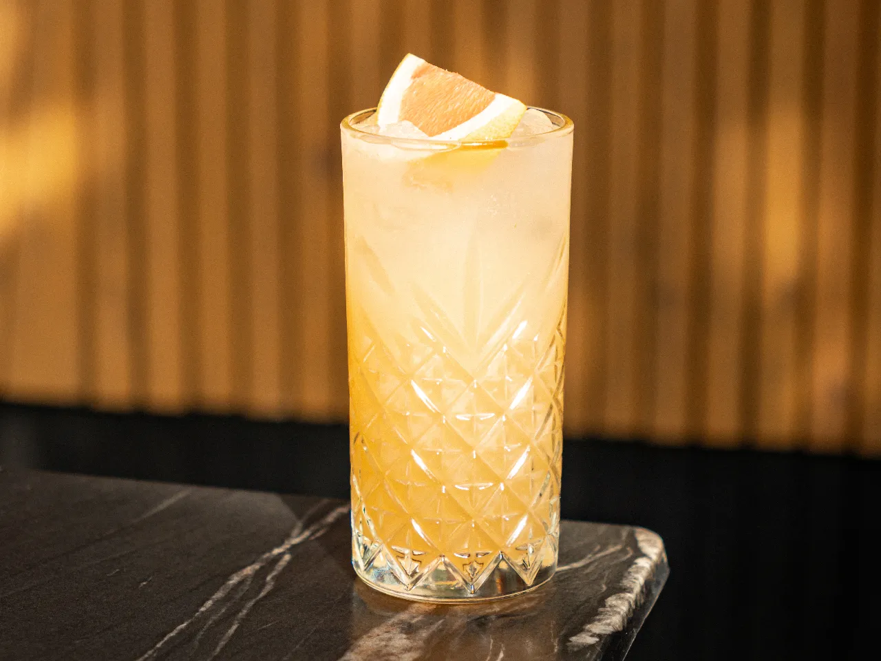 Tequila Herradura Ultra, mezcla de cítricos, pomelo, limón, acompañado de jengibre y syrup simple, finalizamos con tónica de pomelo