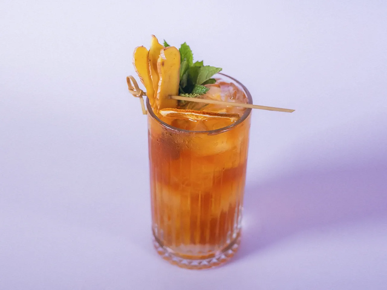 Gin Macerado al estilo Tai, syrup de mango, Vermut Roso , syrup de Manzanilla, Jugo de Limon y Ginger Beer