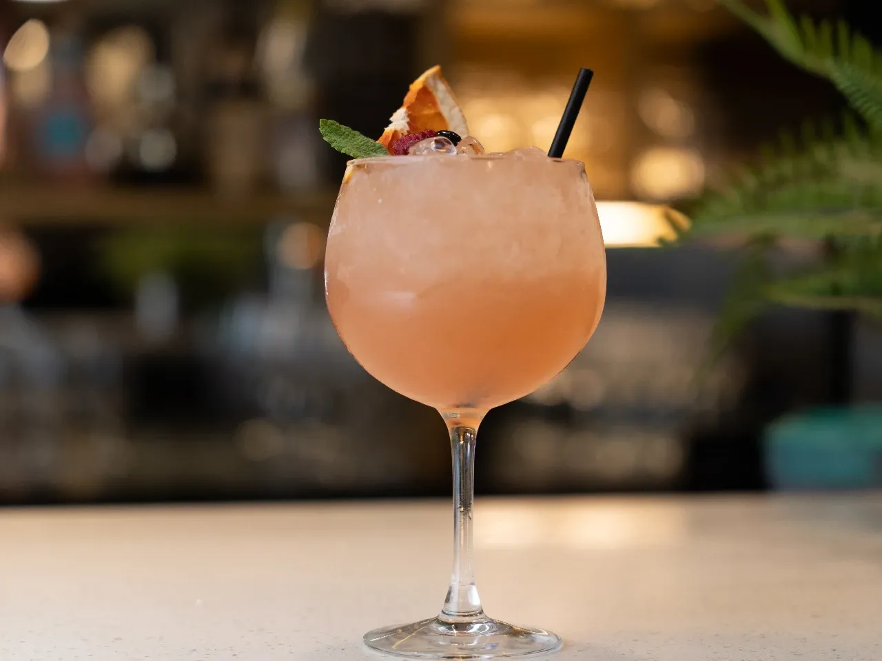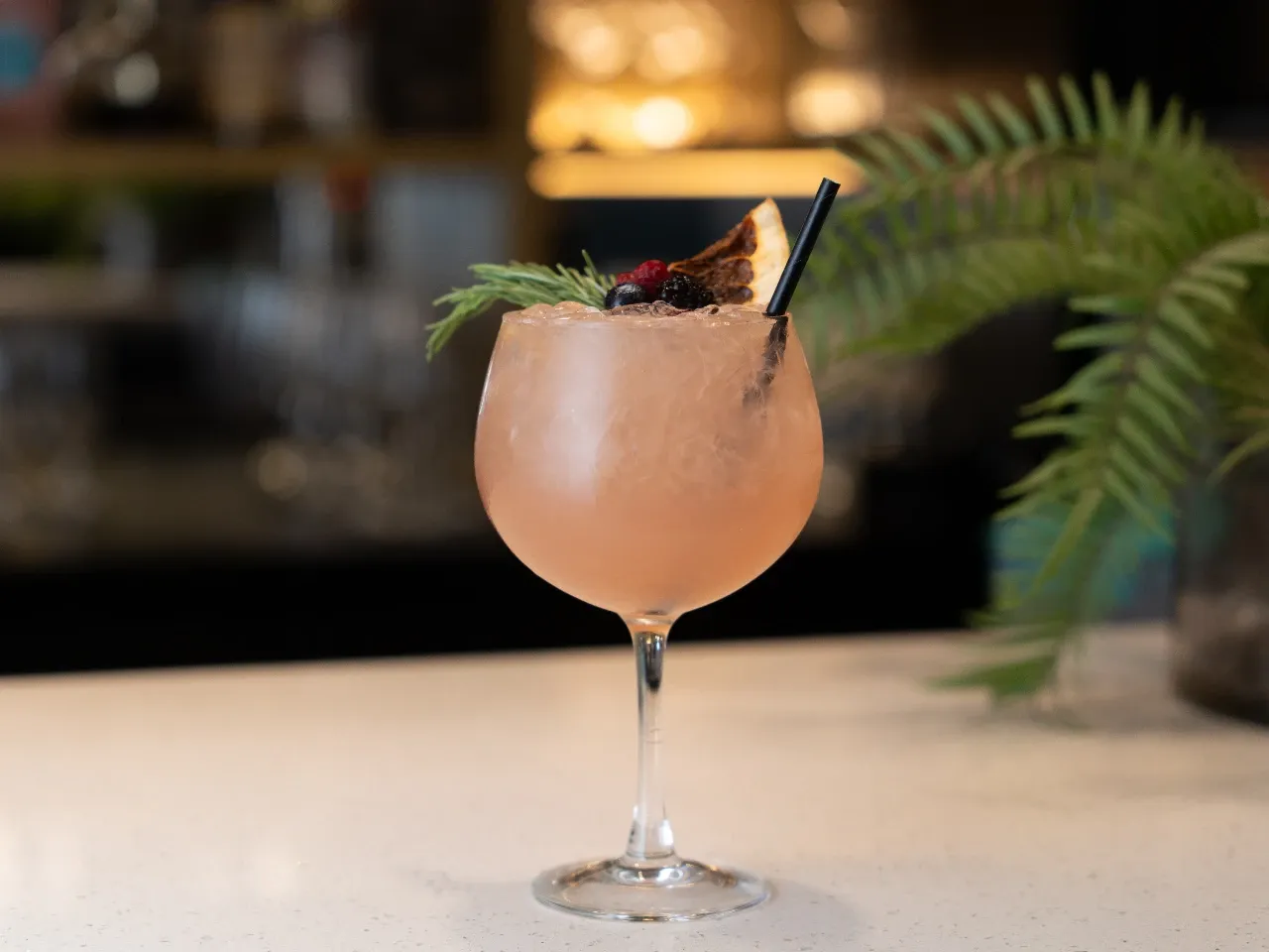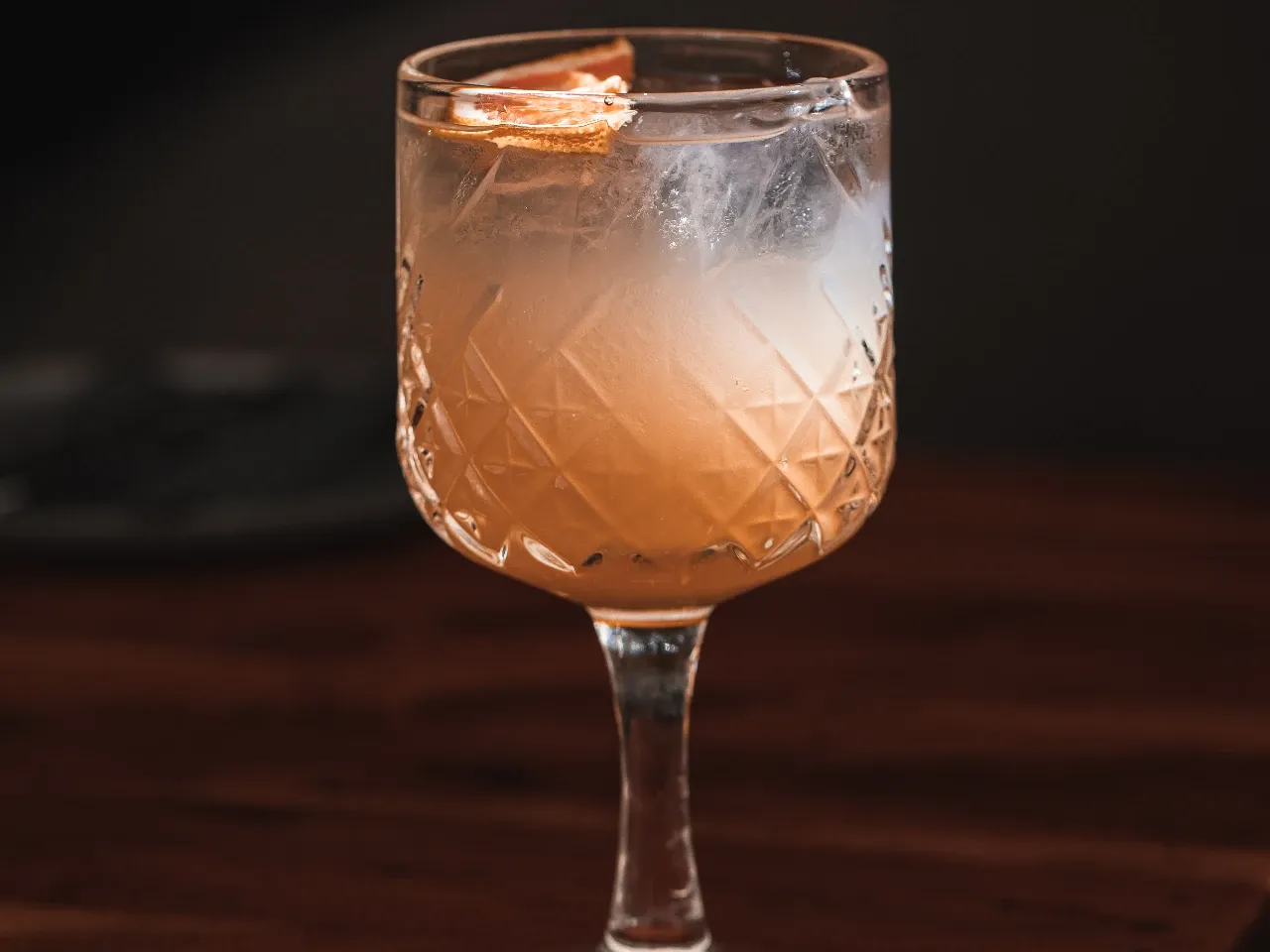 Gin Migrant de Pomelo, Zumo de Pomelo, Syrup de Rosas en Ramazzotti, Zumo de Limón Sutil, media luna de pomelo y Top de Tónica