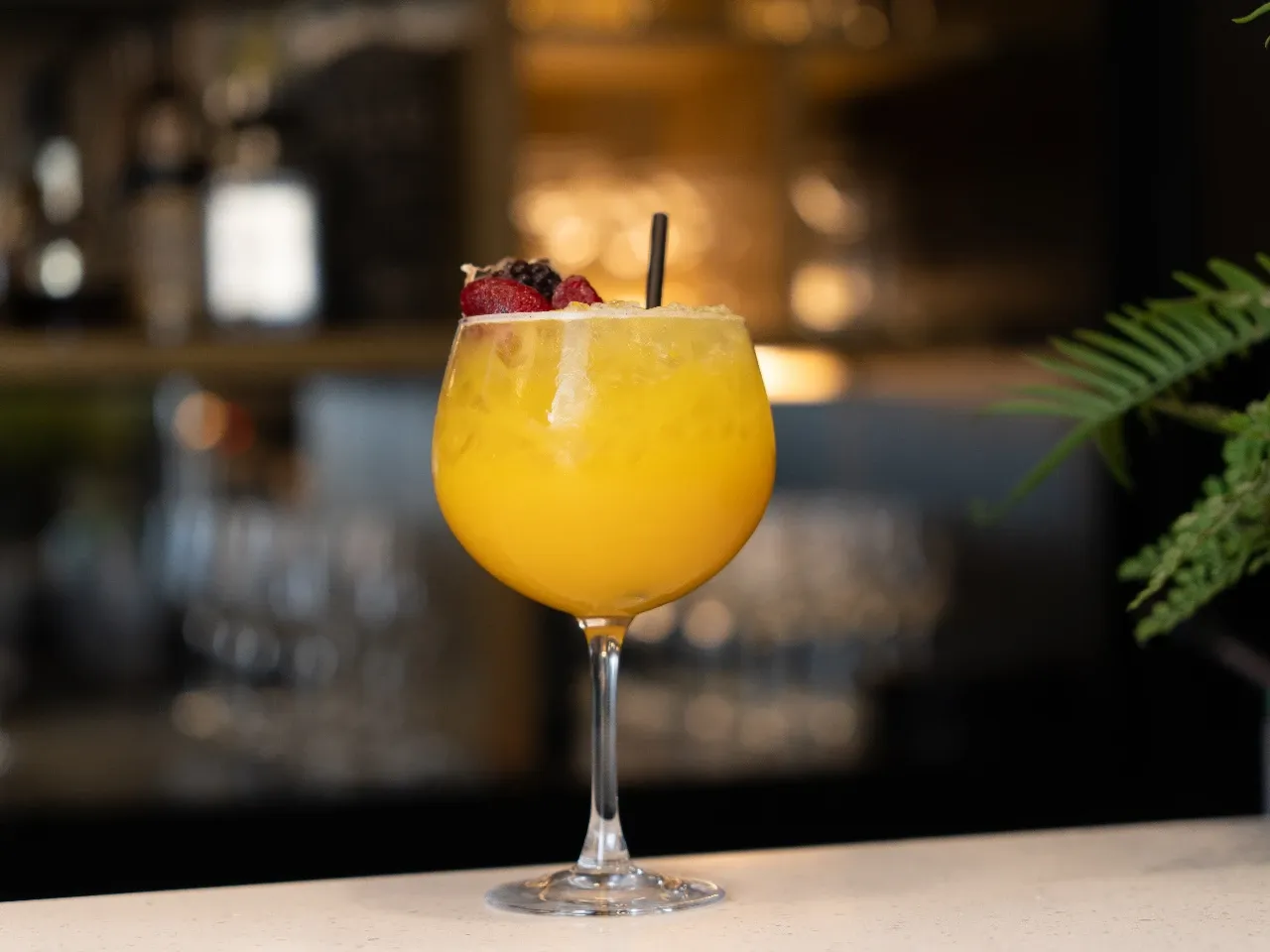 Gin, zumo de naranja, pulpa de mango, syrup, triple sec, sidra. (Arándanos y frutillas como garnish)