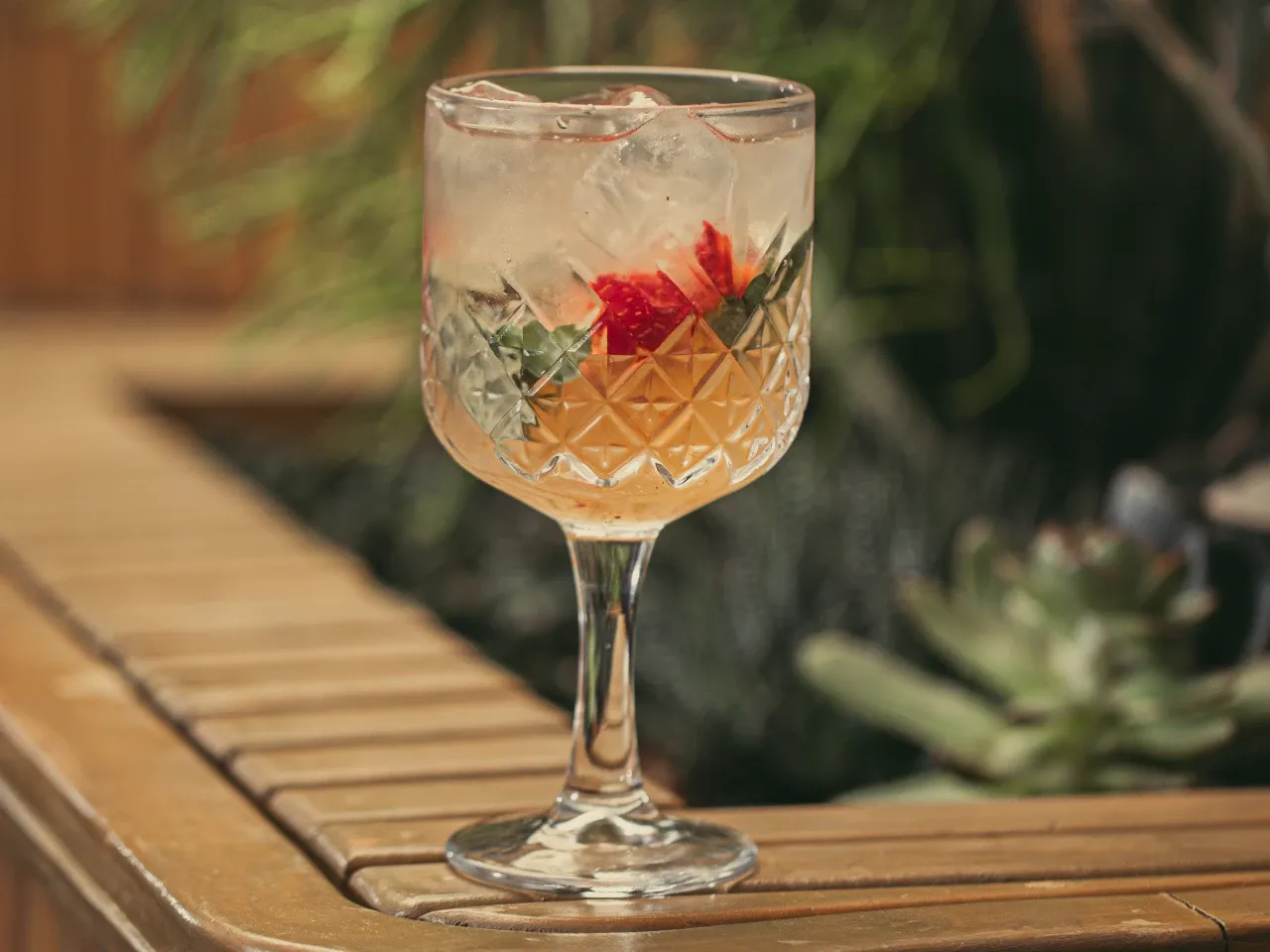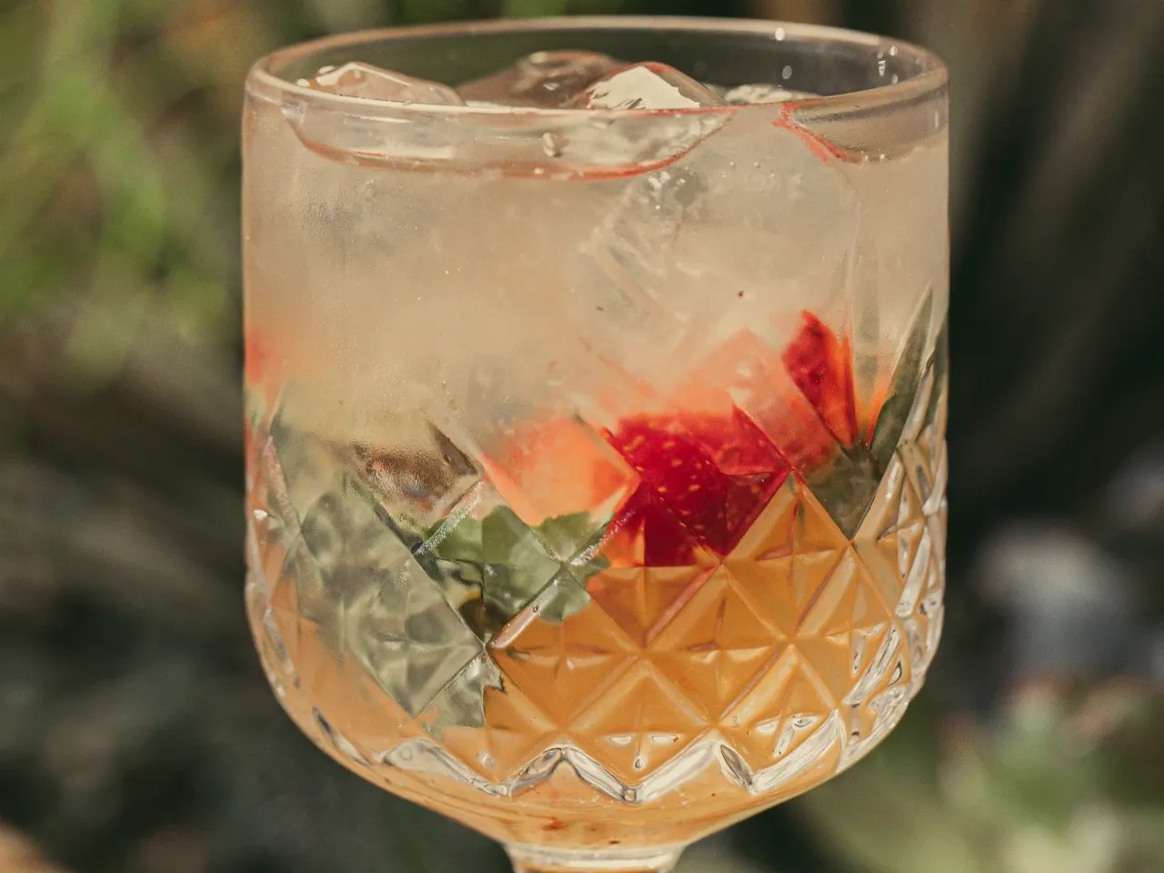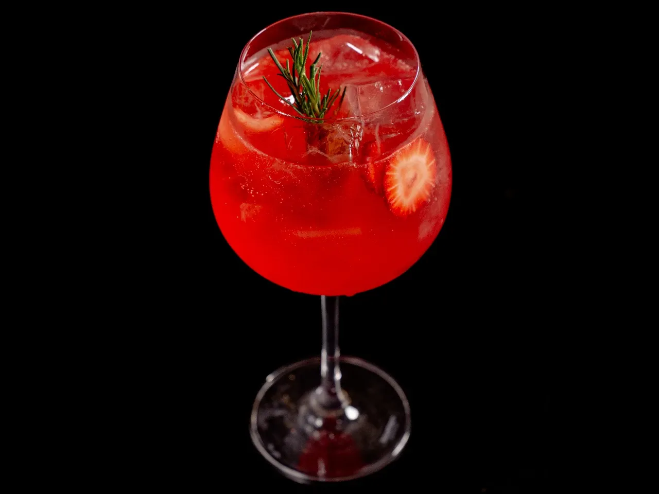 Espumante, frutilla, albahaca, agua con gas y syrup frutilla canela