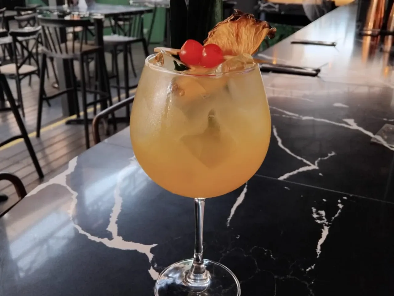 a base de ron flor de caña añejos 5 años, Cointreau, Horchata de arroz y coco, Cordial de piña, Shurbs de lima y syrup simple. Quieres probar nuestras bombillas comestibles? Limon de pica, Frutilla, Chocolate (+$1.000)