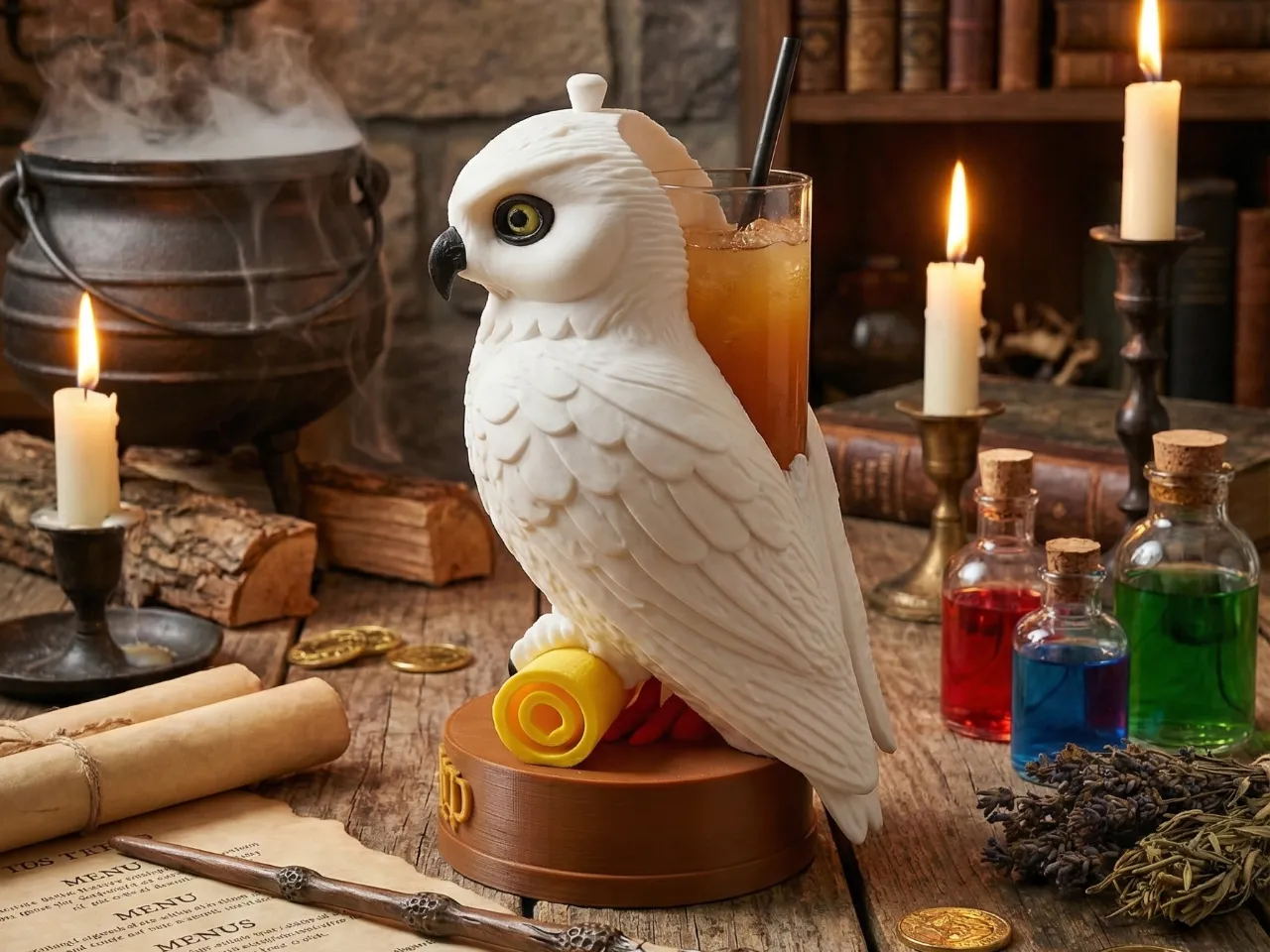 Cocktail nacido en la tierra de las lechuzas mágicas, en base a Ronchata de Piña, Whiskey Johhnie Walker Rojo y Salsa de Chocolate. Muy resfrescante y delicioso. En un soporte embrujado que te hará vivir una experiencia inolvidable…