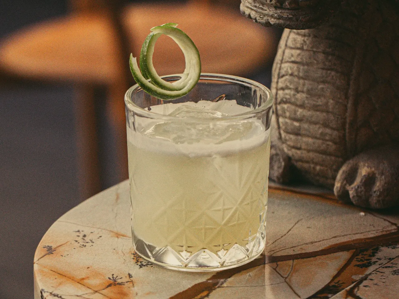 A base de Ron francés de Martinique, syrup de miel, jugo de limón, espumante extra brut, dash aceite de cacho cabra. Perfil : coctel suave con notas a madera, miel y un retrogusto caluroso