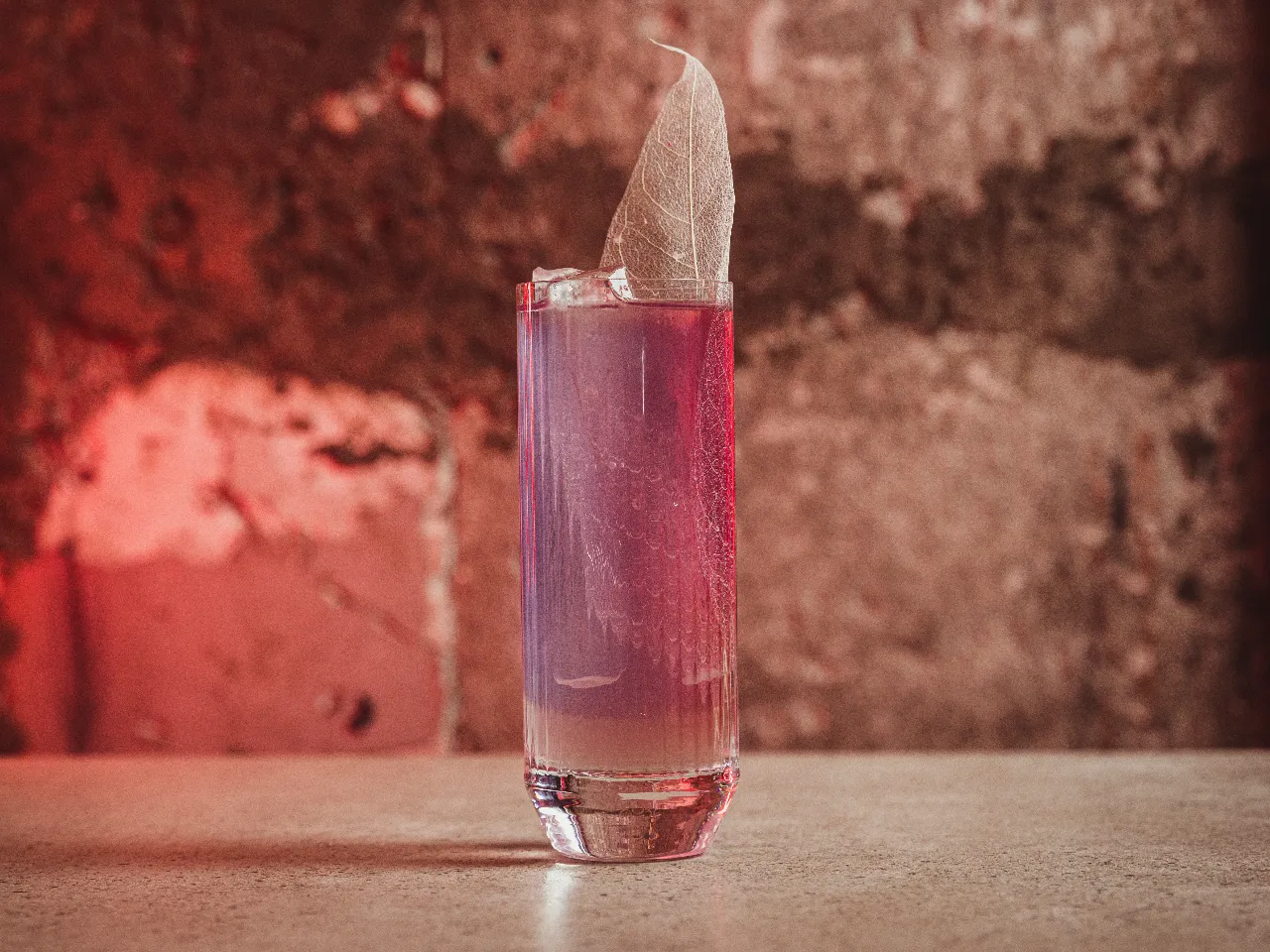 Gin beefeater 40, licor de cassis, zumo de Limon, sirup de rocoto, terminado con ginger light y agua con gas, deshidratado de manzana