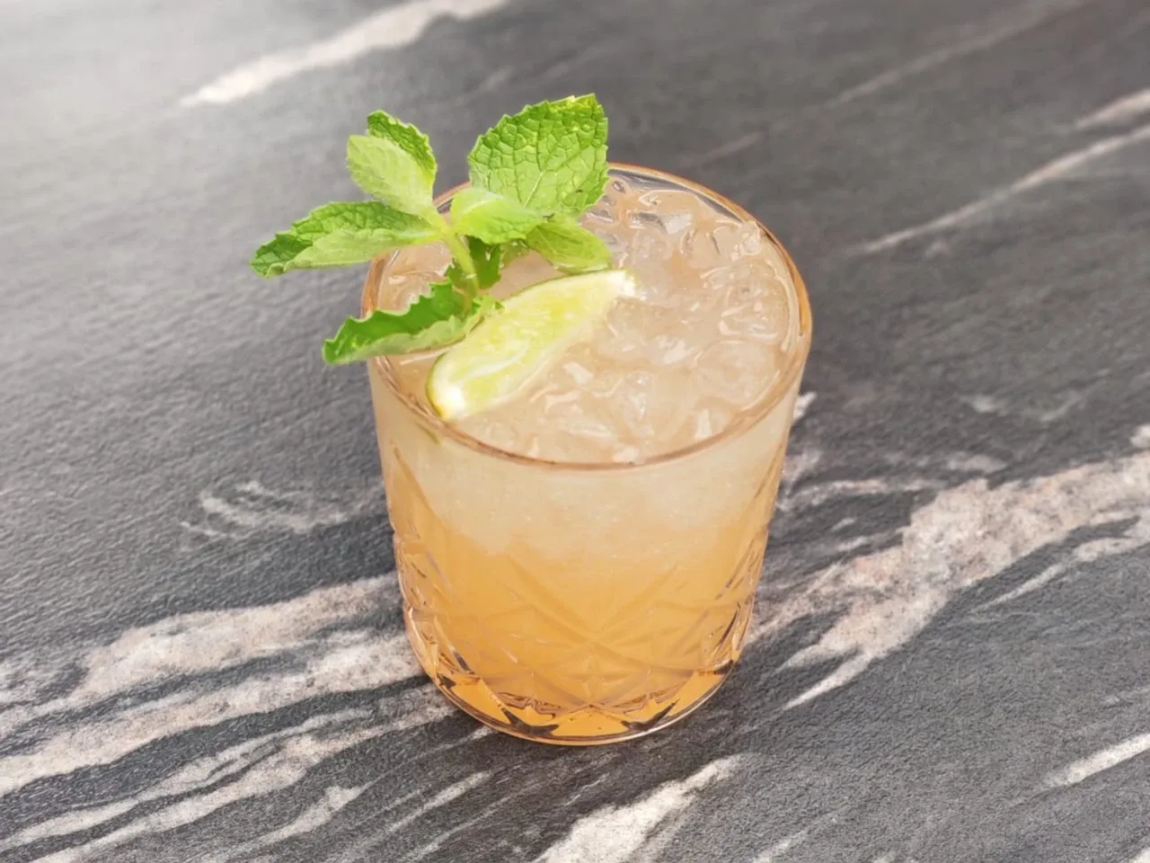 Preparación en base a gin Kantal, Kombuchacha de té verde, hojas de menta, jengibre y limón.