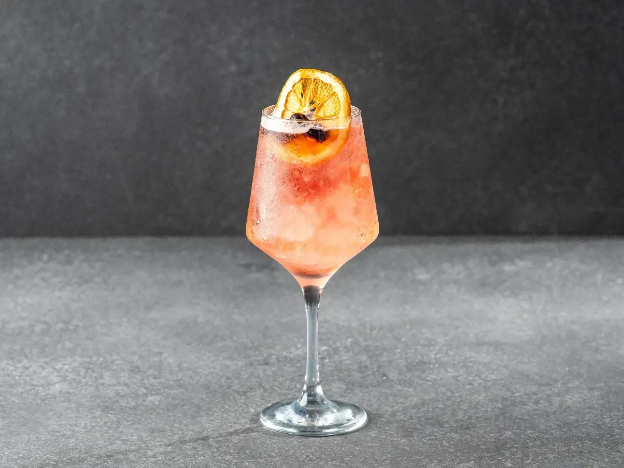 Un spritz aromático de Ramazzotti equilibrado con kombucha de arándano. Burbujeante, ligero y refrescante.