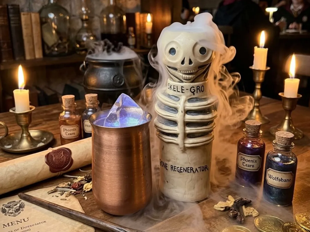 Hey! Alguna fractura o producto del quiddich? Víctima de la poción rompe huesos? Bebe ya, el remedio más antiguo para la regeneración de huesos. La suavidad del gin london dry, un destilado milenario, acompañado de un macerado de manzanilla y limón sutil en triple sec, sour mix para resaltar sabores y para finalizar con la …
