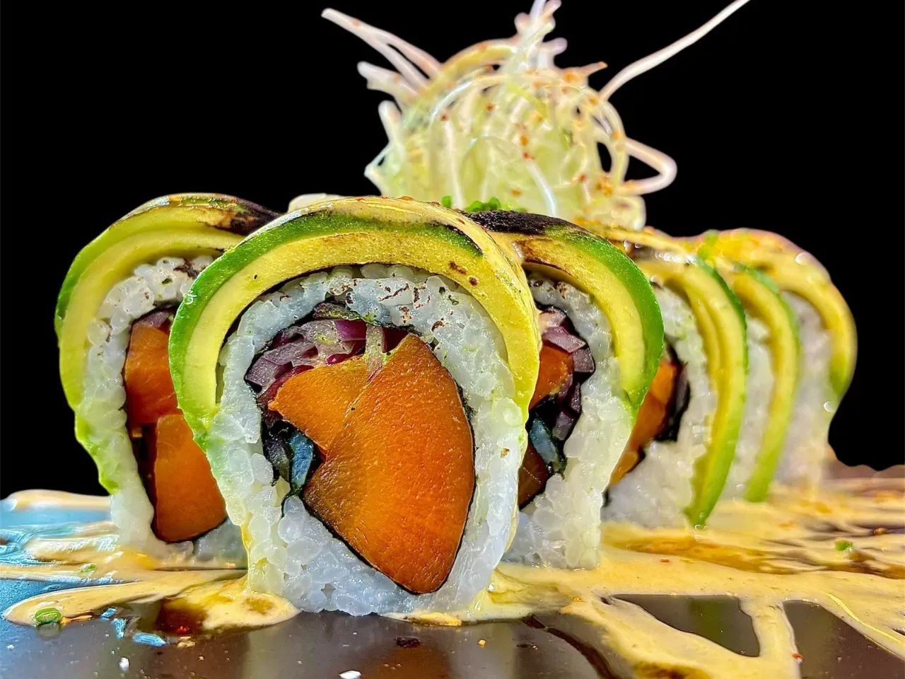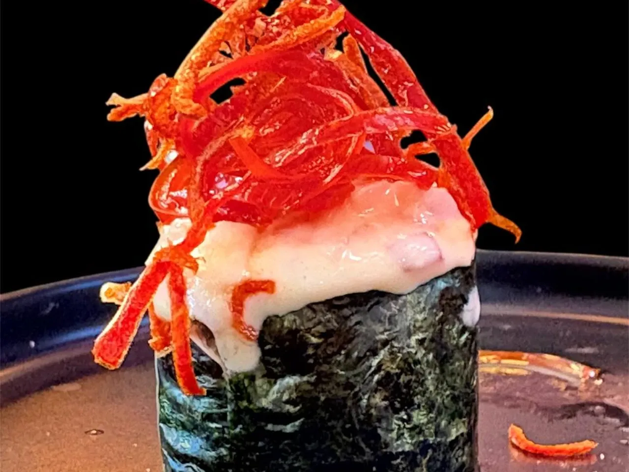 Roll relleno con cebolla morada y zanahoria cocinada en soya y sésamo, bañada en mayonesa de aji amarillo y flambeado con topping de togarashi y cibulette.