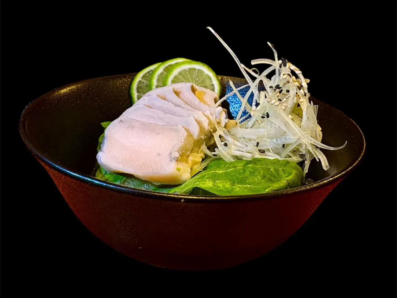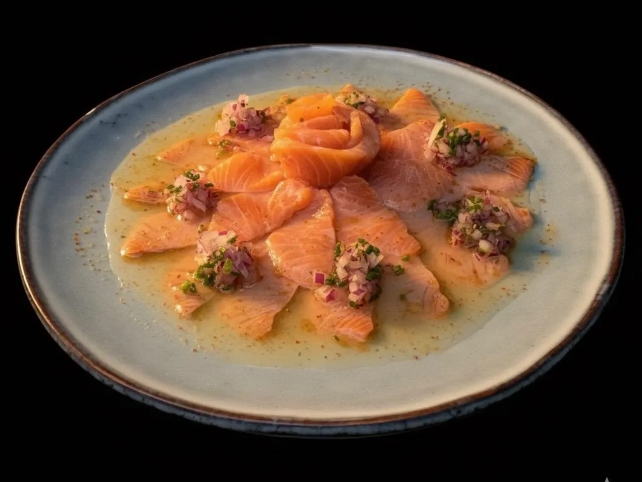 Fresco tiradito de salmón, con una sabrosa limoneta de tigre, un toque de aceite de sésamo y un leve picor de togarashi. Se completa con cebolla morada, ciboullette y un toque de sal que realza todos los sabores. Refrescante, liviano y lleno de sabor.