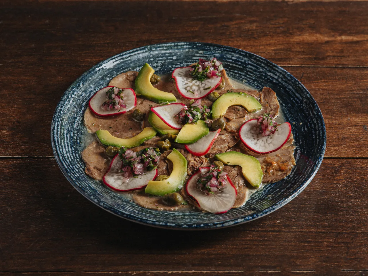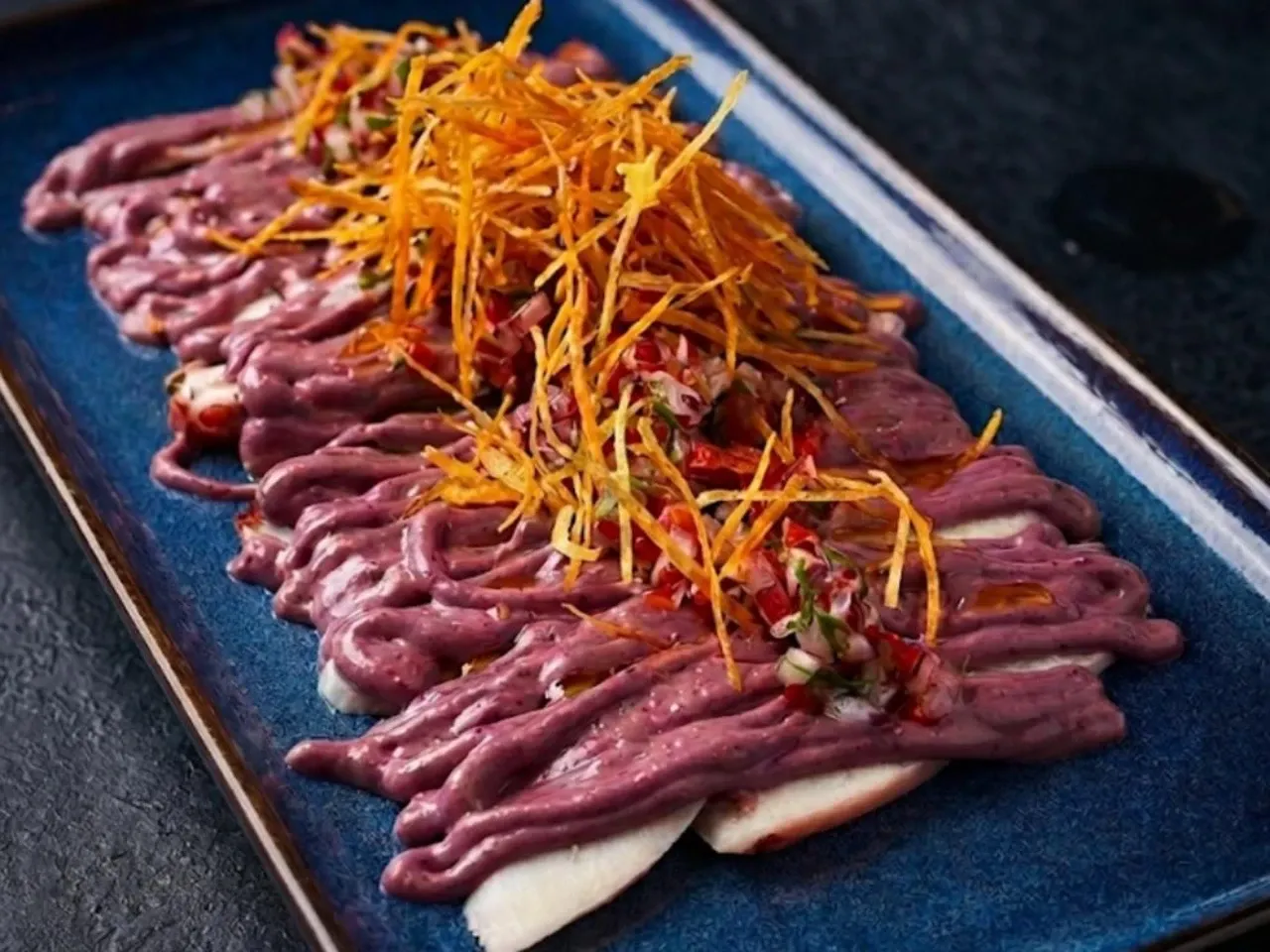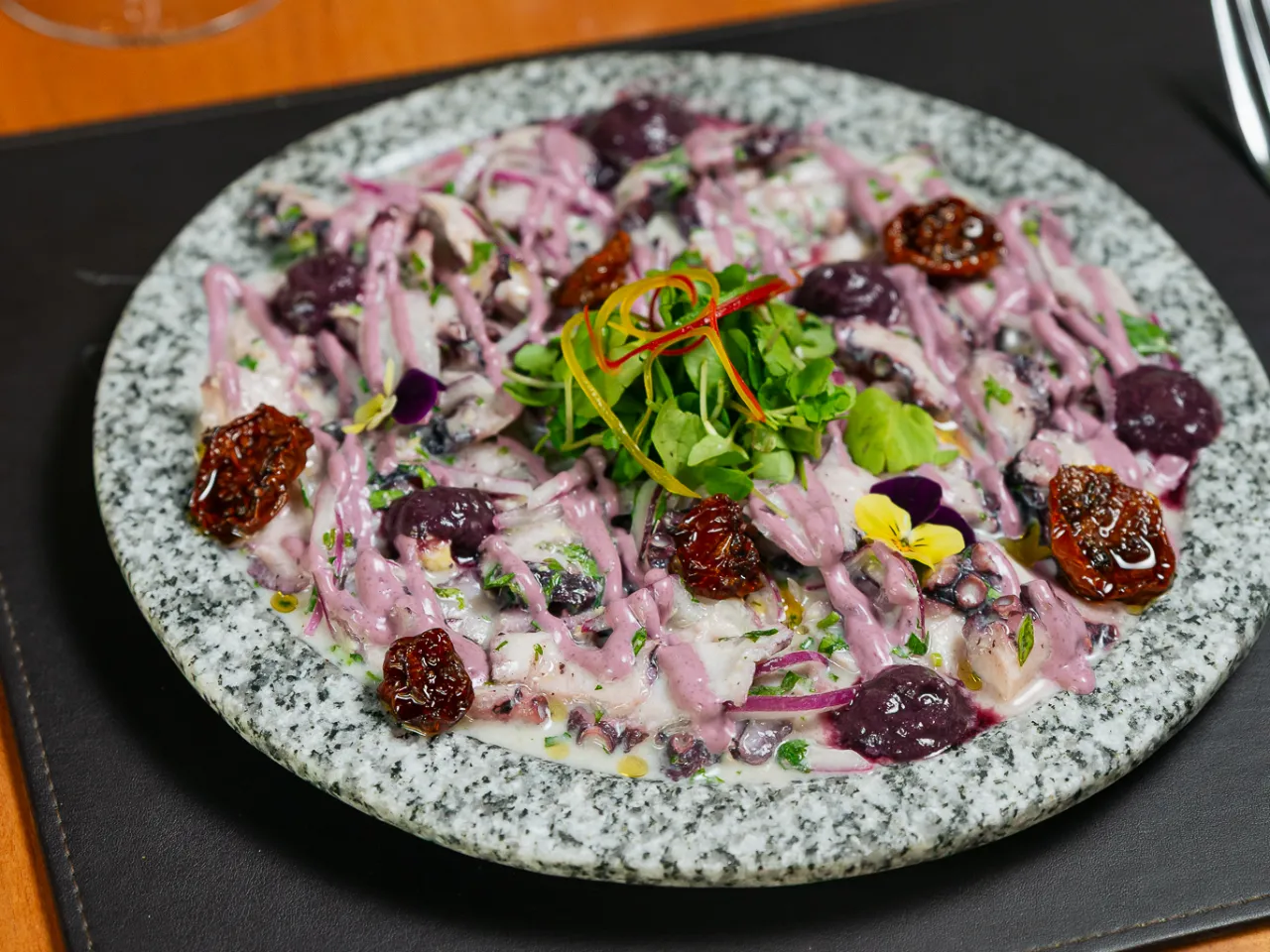 FINAS LONCHAS DE PULPO CON CREMA DE ACEITUNA DE AZAPA, CEBOLLA MORADA Y JUGO DE LIMON