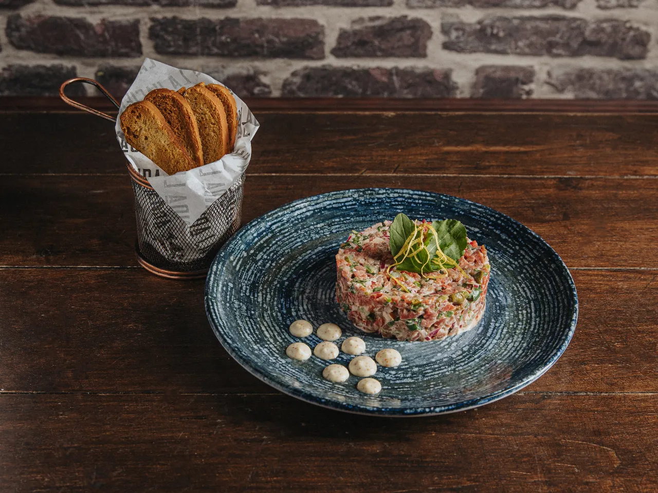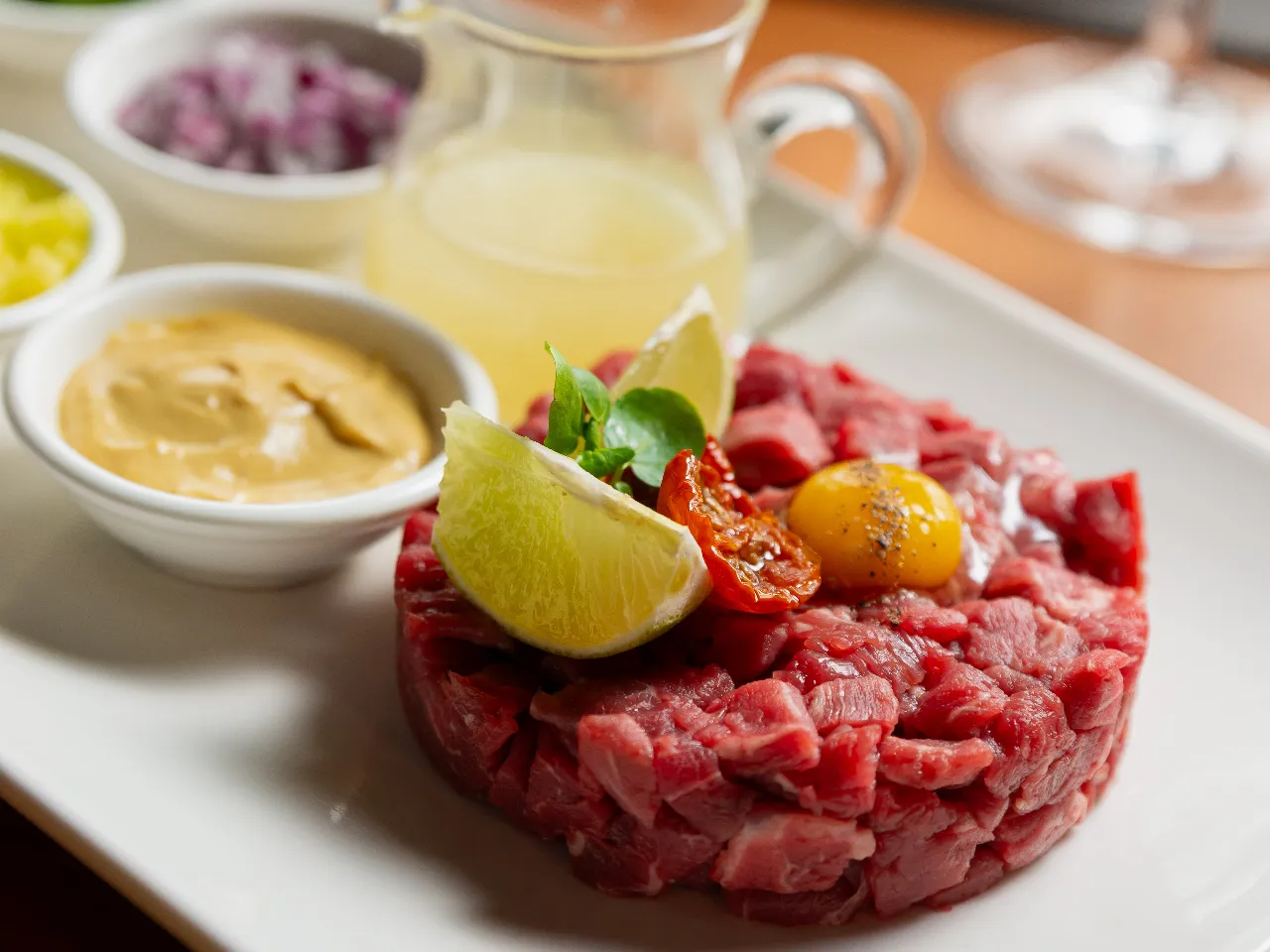 200 GRAMOS DE FILETE TROZADO, ACOMPAÑADO DE CEBOLLA MORADA, PEPINILLOS, AJÍ VERDE CORTADO EN PETIT BRUNOISE, CILANTRO EN CHIFFONADE, MOSTAZA DIJON Y HUEVO DE CODORNIZ