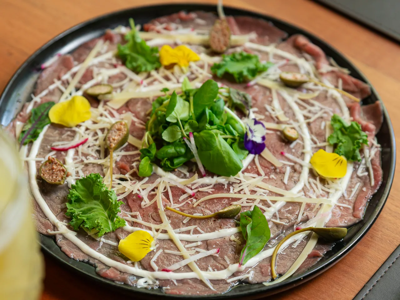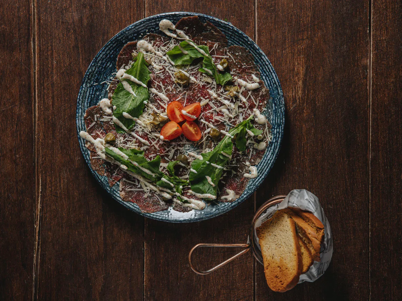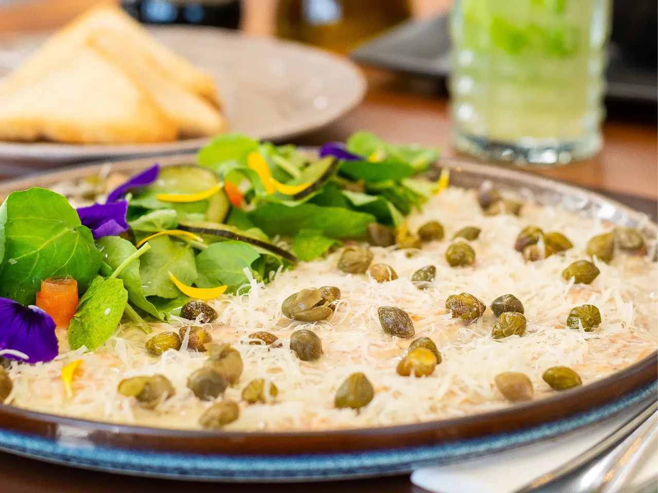 Filete sazonado, acompañado de rúcula, queso parmesano, alcaparras, mayonesa de trufas y tostadas