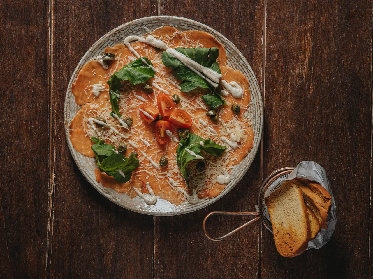 Finos cortes de salmon ahumado con alcaparra, queso parmesano y jugo de limon