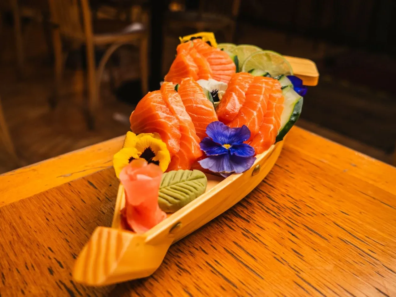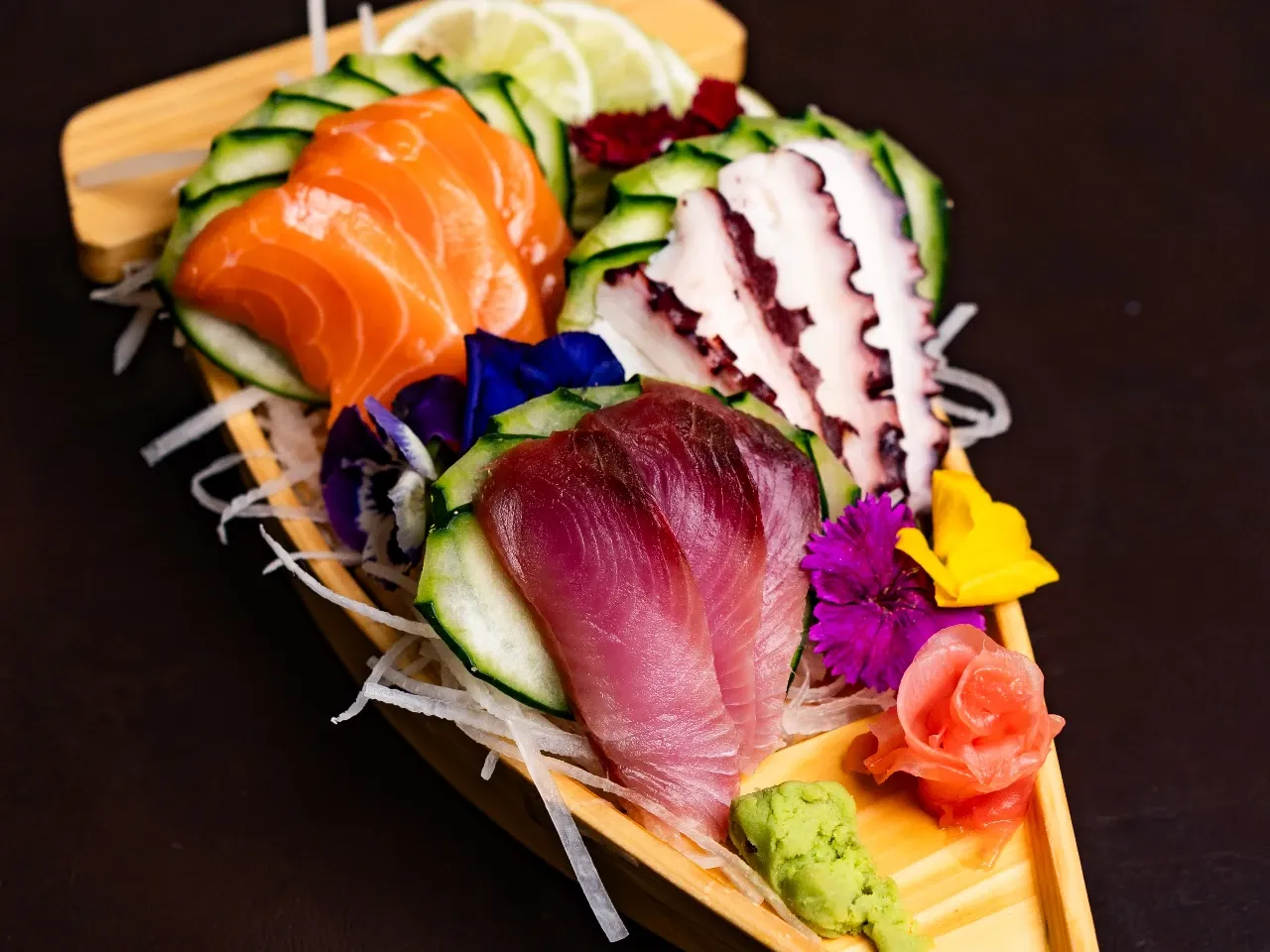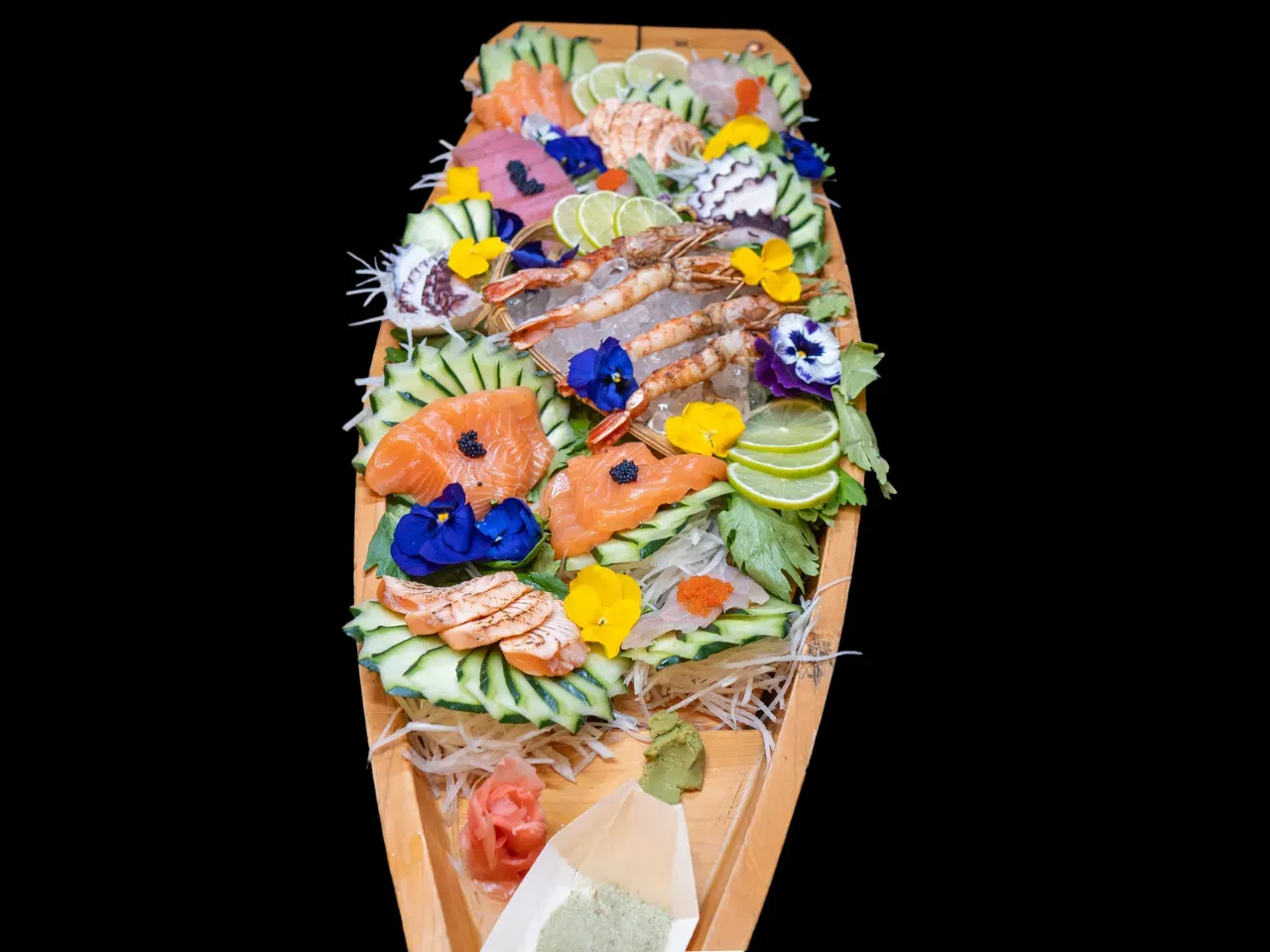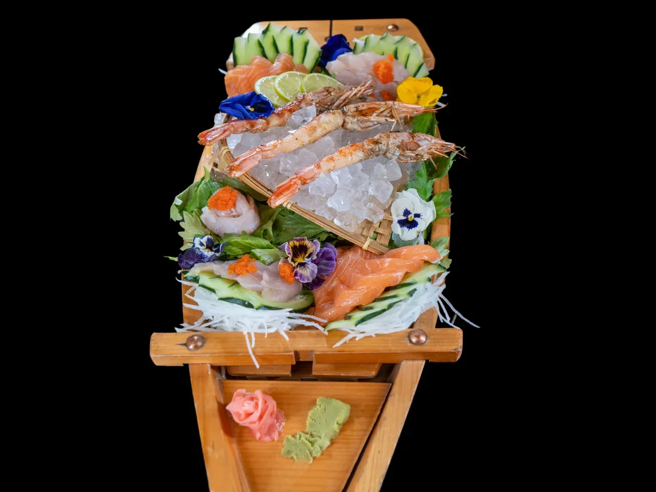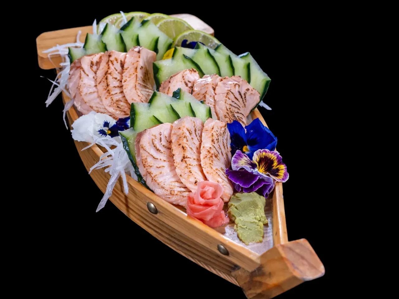 Sashimi de salmón fresco, sashimi del pescado del día, cortes de salmón aburi, sashimi de atún fresco, cortes de pulpo, langostinos grillados, caviar negro y masago.