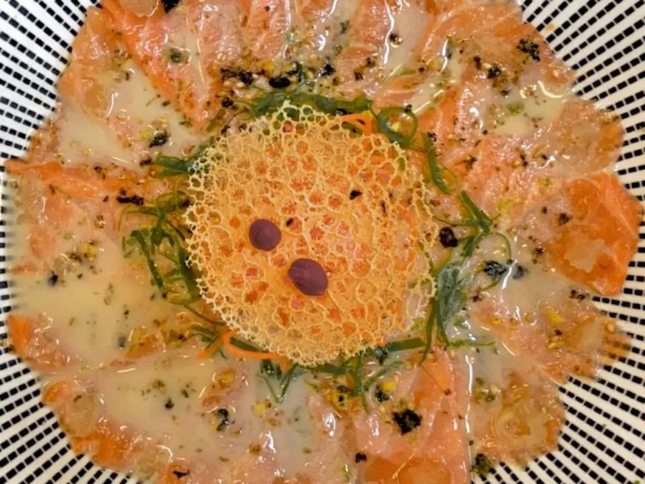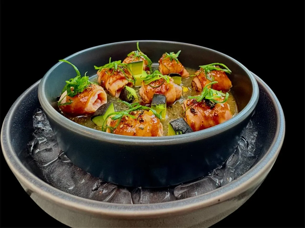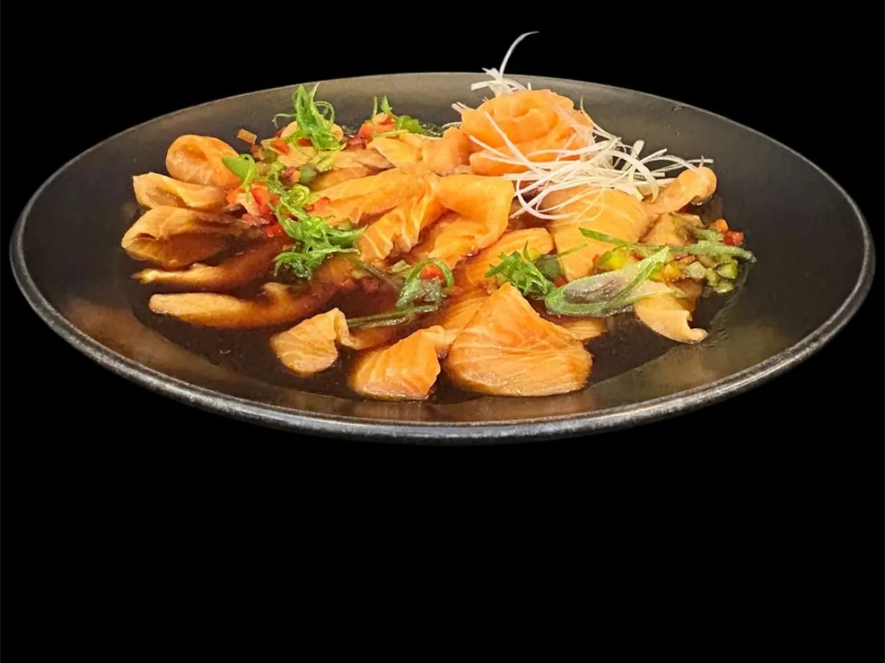Finos cortes de salmón con pimentones y cebollín, bañados en un dressing de soya, limón y aceite de trufa.