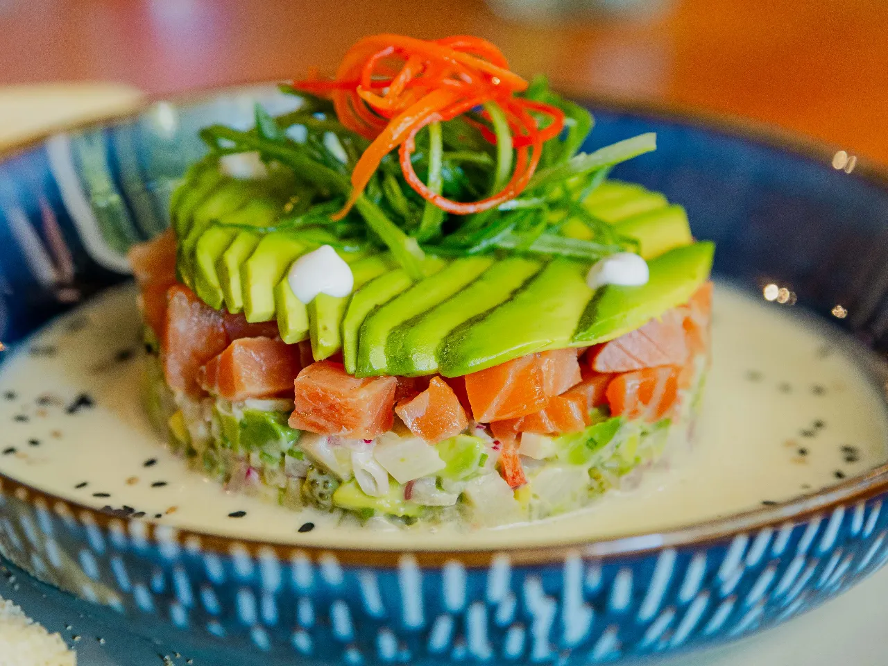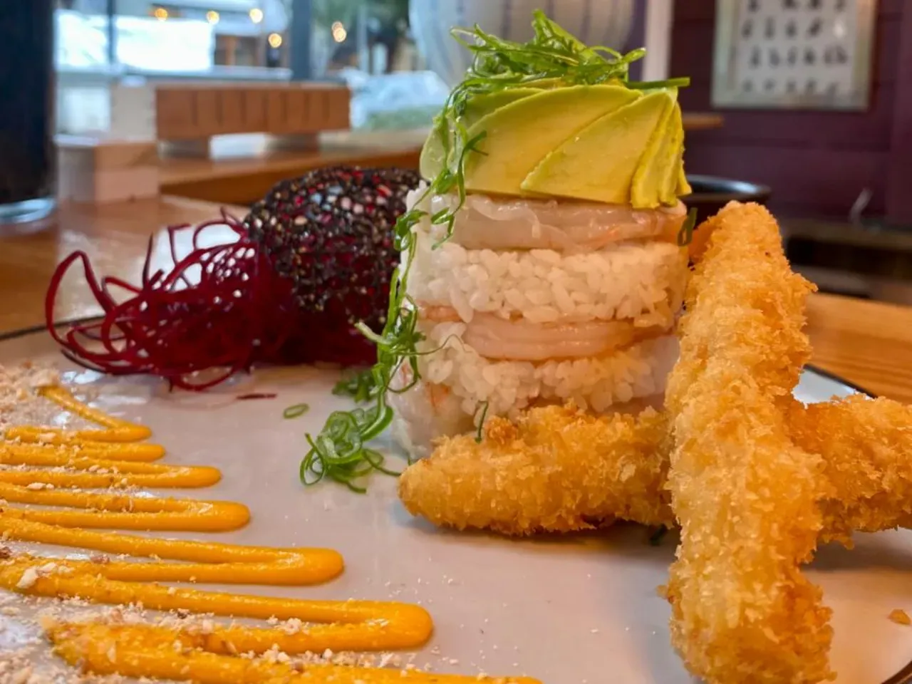 Timbal de arroz con: salmón, palta, camarón y camarón tempura Opcional – salsa acevichada