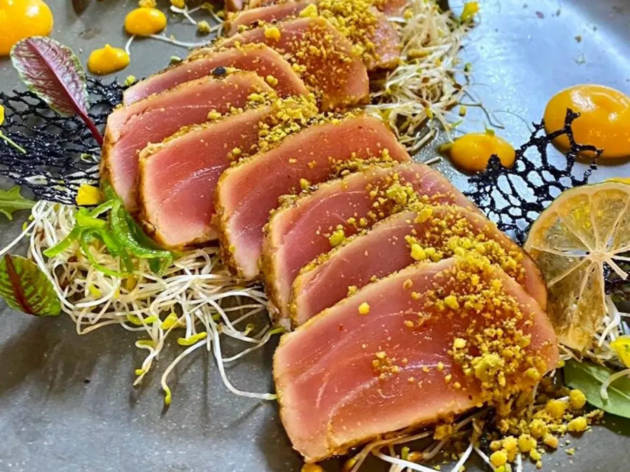 Finos cortes de atún sellados en pistacho, sobre cama de brotes acompañados en salsa ponzu.