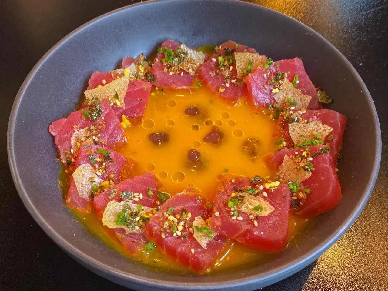 Finos cortes de atún en leche de tigre amarillo, con toques de furikake y ciboulette.