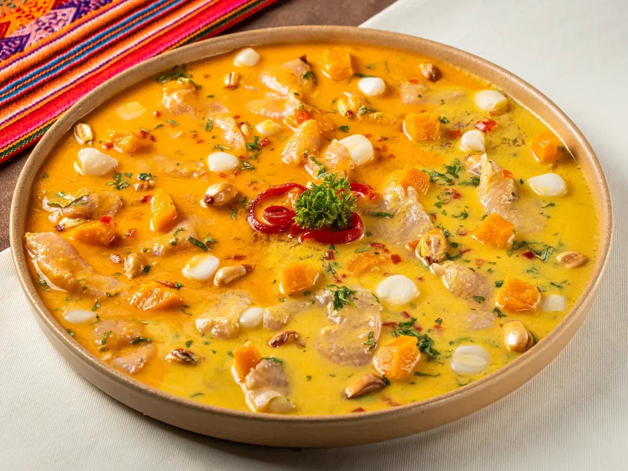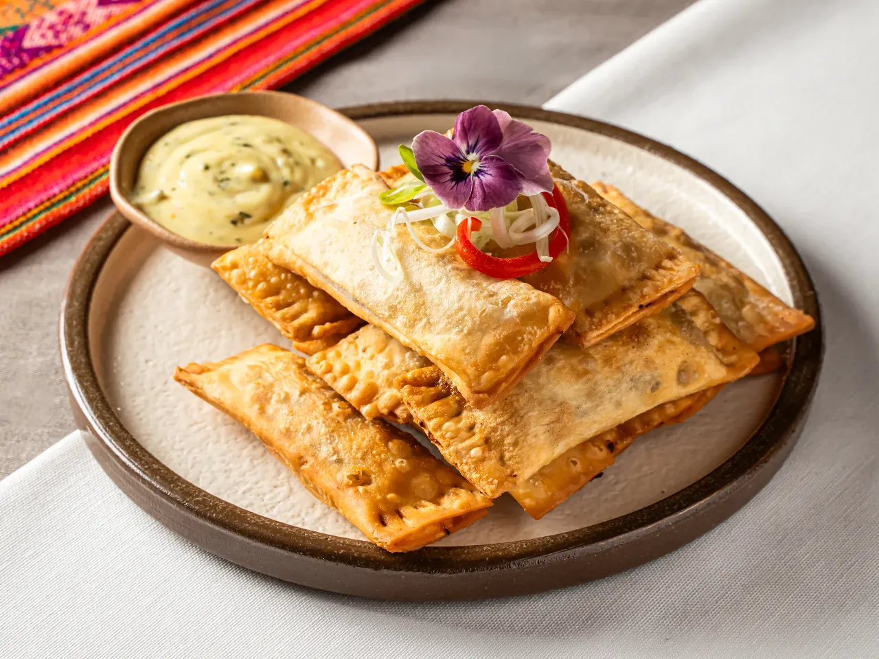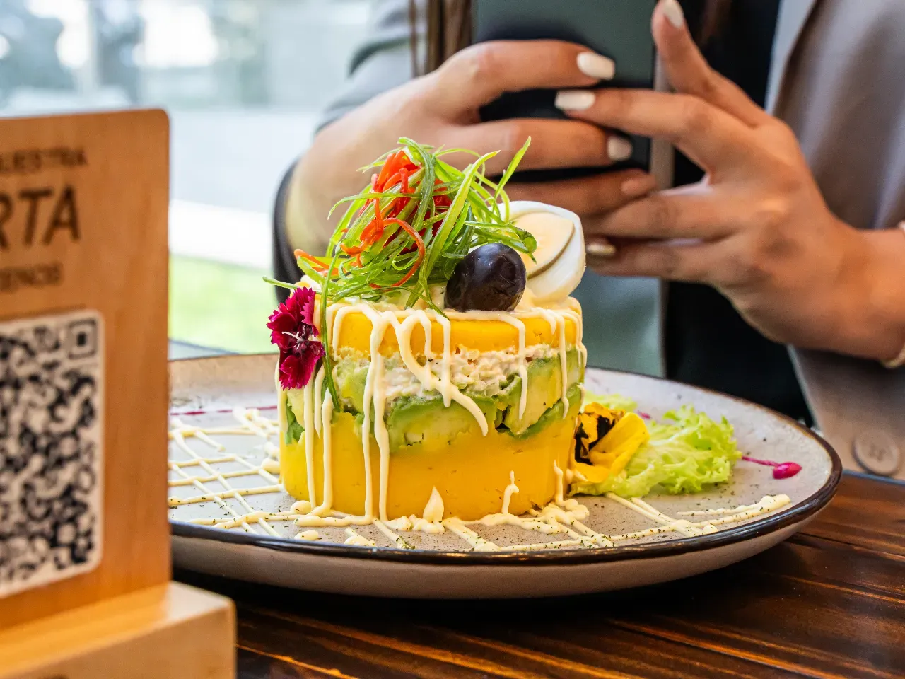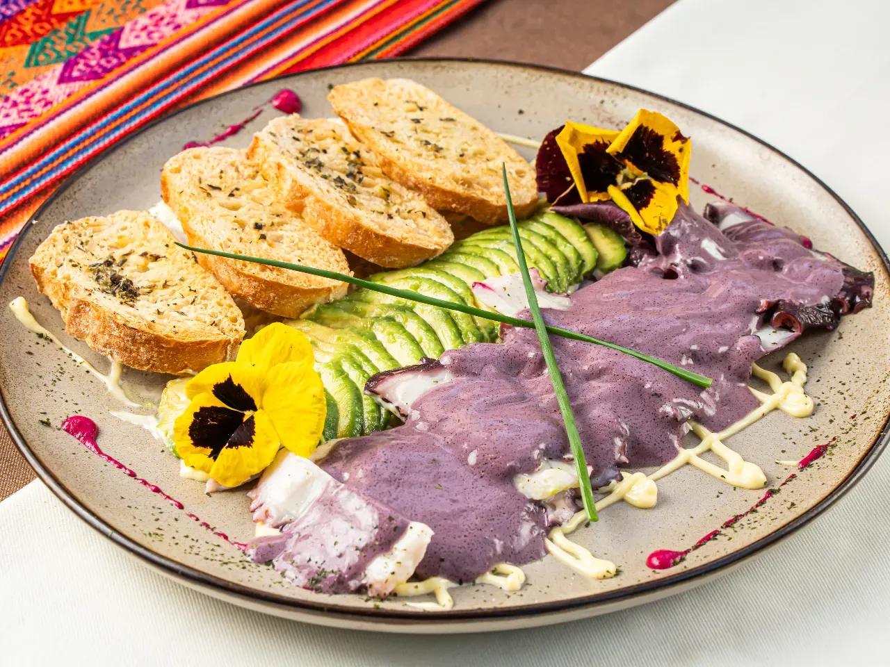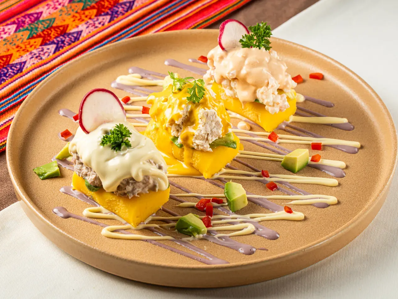 Finos cortes de pulpo bañadas en salsa al olivo, acompañadas de fresca chalaca y crocante camote frito.