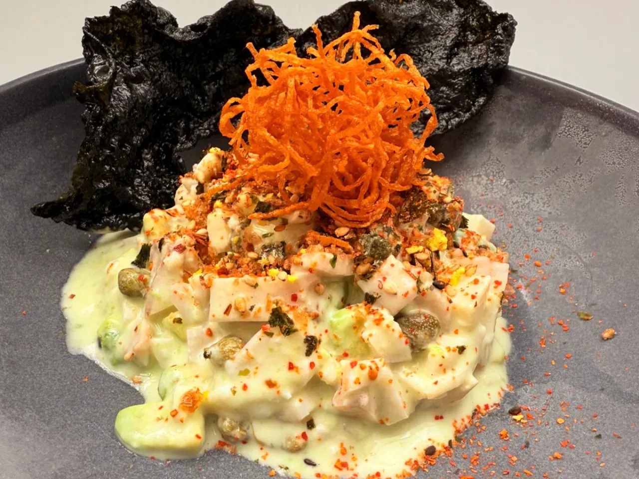 Finos trozos de locos marinados, mezclados con palta en cubos, lactonesa suave y alcaparras. Toques de furikake aportan umami, mientras un crocante de nori y fideos de zanahoria fritos añaden textura. Una entrada fresca, elegante y equilibrada.