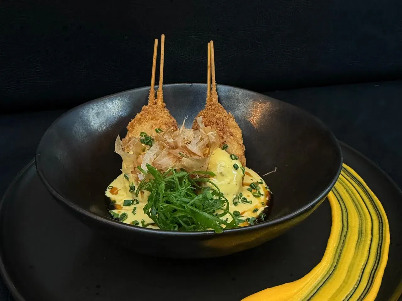 Brochetas de atún tempurizado acompañado de mayonesa de ají amarillo y salsa unagi con toque de cibulette coronado con bonito.