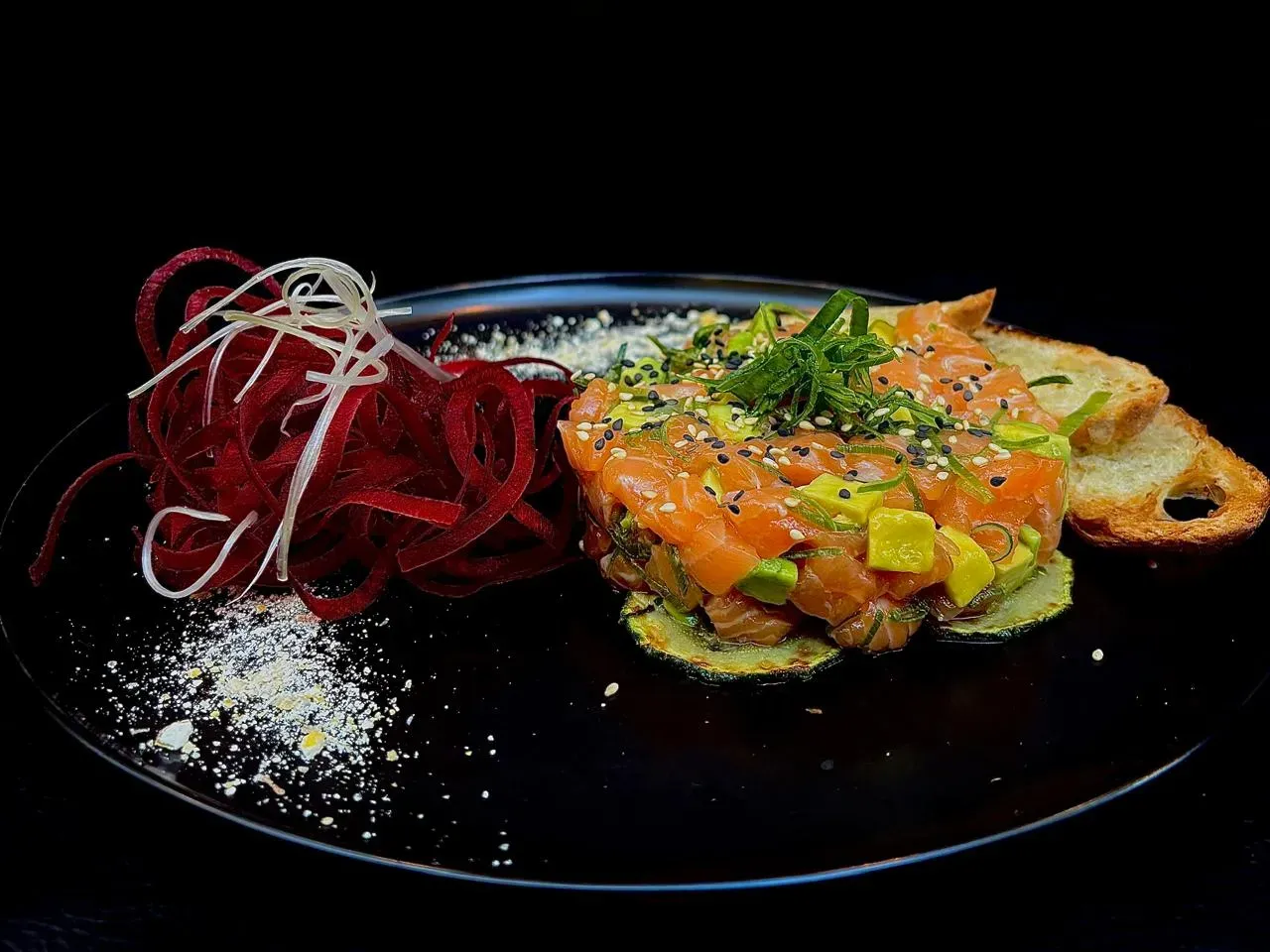 Salmón fresco y palta, delicadamente mezclados con aceite de sésamo y cebollín, sobre una cama de zapallo italiano sellado en aceite de oliva.