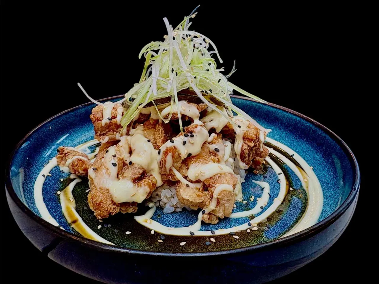 Muslo de pollo rebozado y frito con salsa agridulce y mayonesa kewpie con arroz shari y pepino encurtidos.