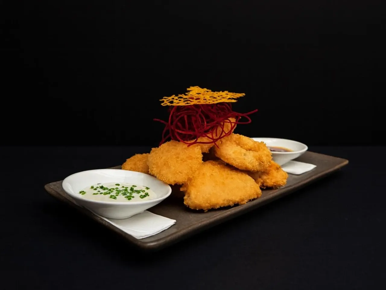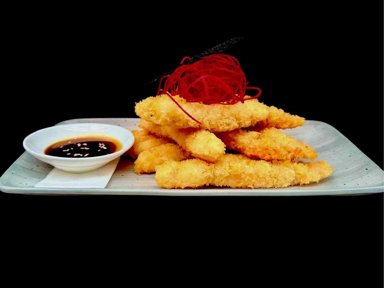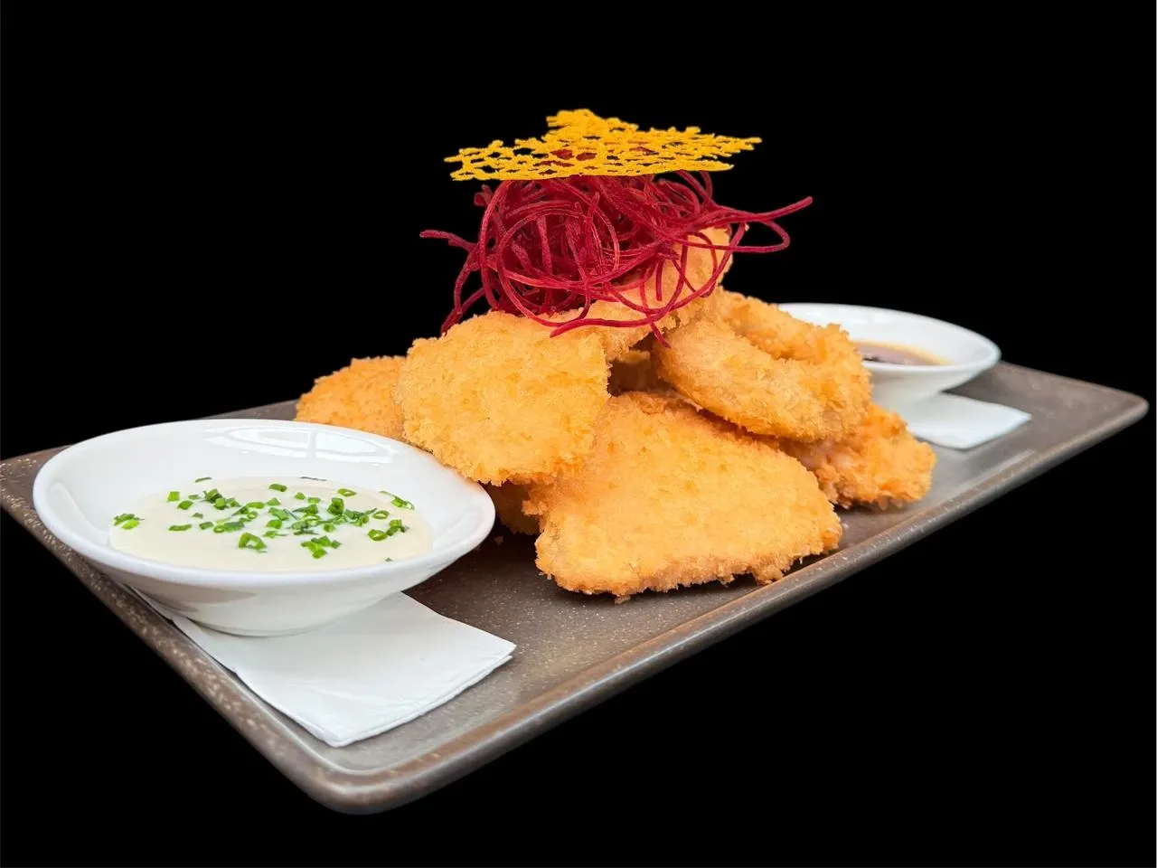 Mix Tempura Panko 3 cortes de salmón, 3 de camarones y 3 de calamares. Acompañado de salsa teriyaky y salsa acevichada.