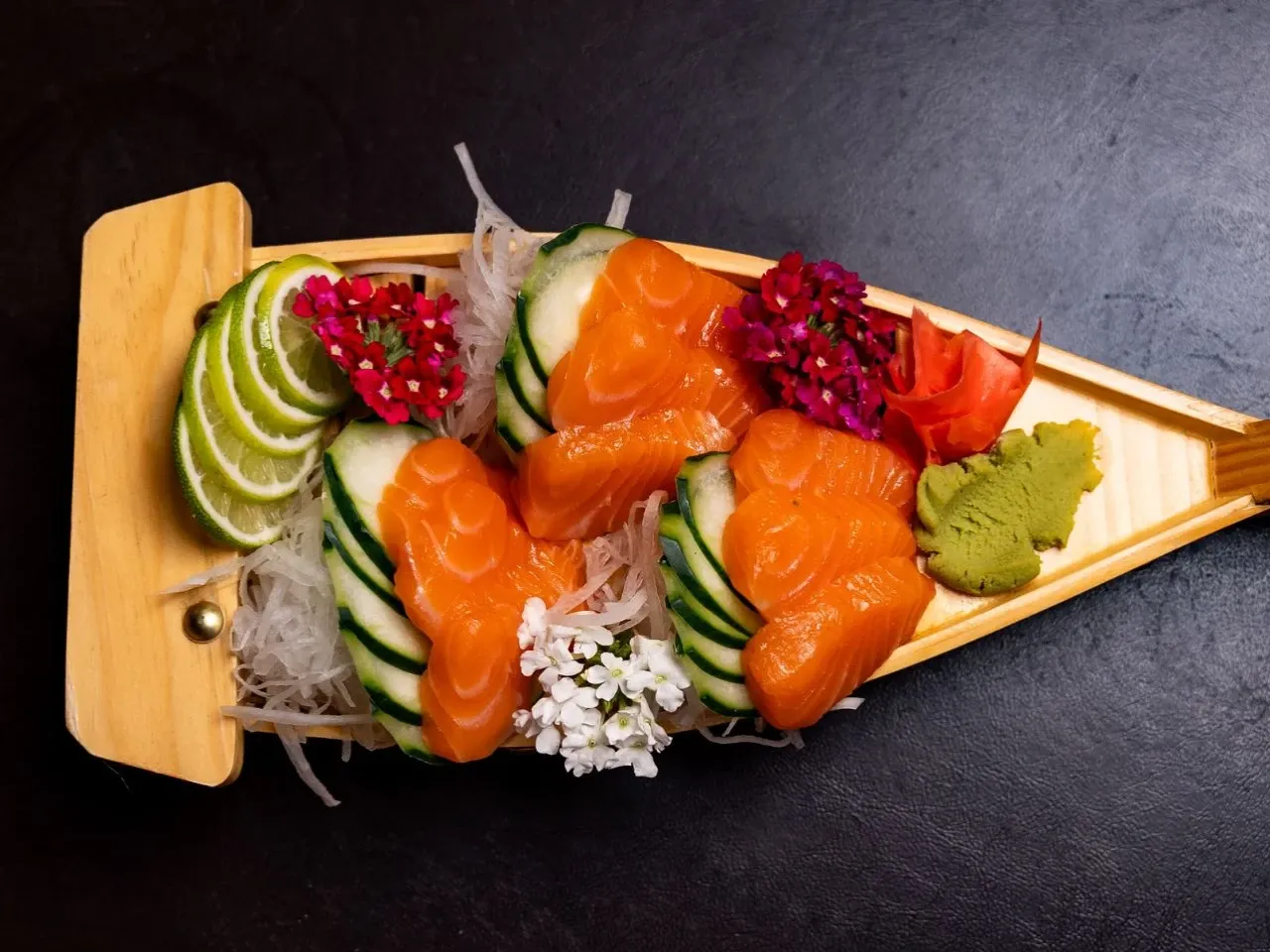 Sashimi de salmon,sashimi de pescado del dia,langostinos grillados,hojas de apio,pepino,nabo y masago
