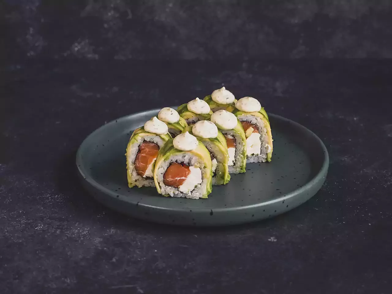 10 Makis rellenos de salmón, queso crema y ciboullete. envuelto en palta con dressing de albahaca.