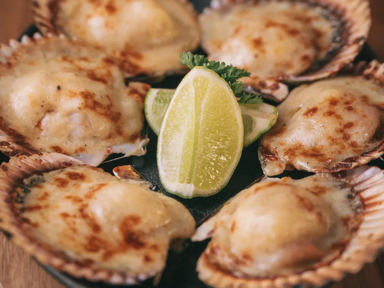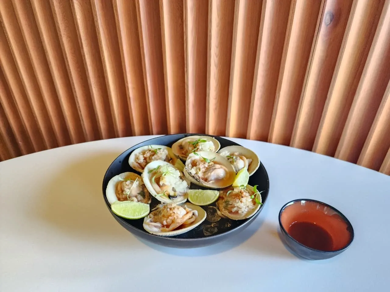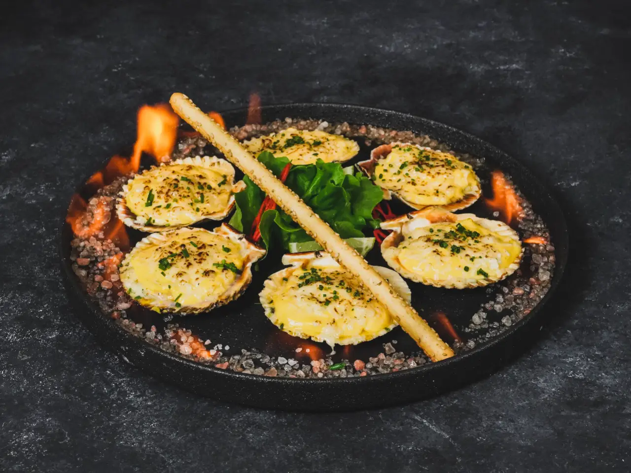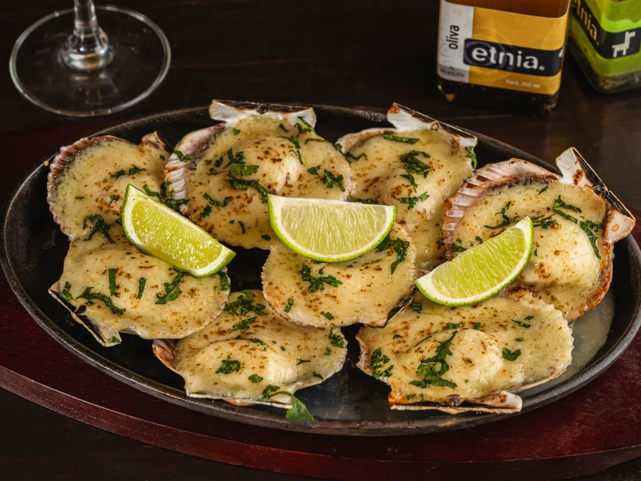 5 Ostiones en concha al natural y 5 Ostiones en concha a la parmesana. Acompañados de snacks y salsas.