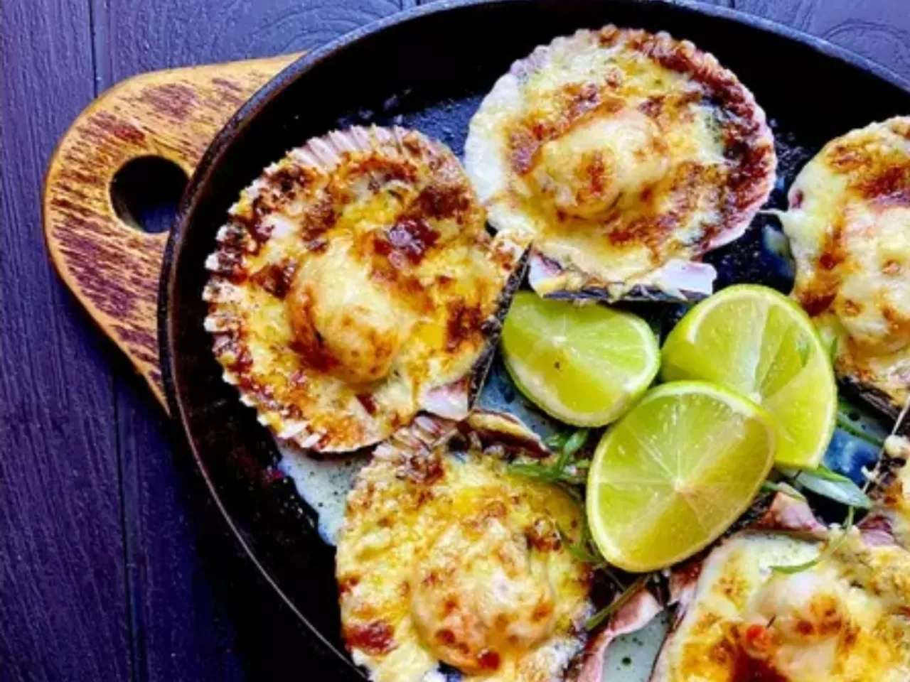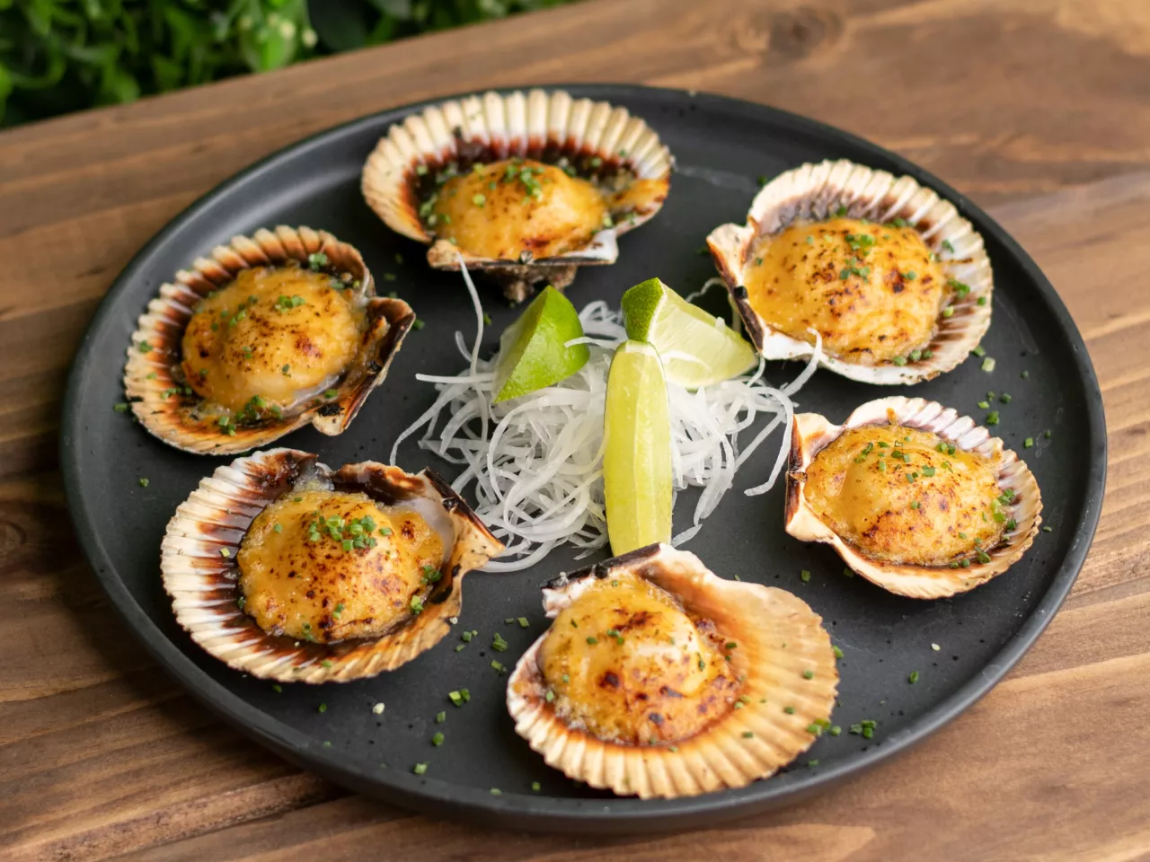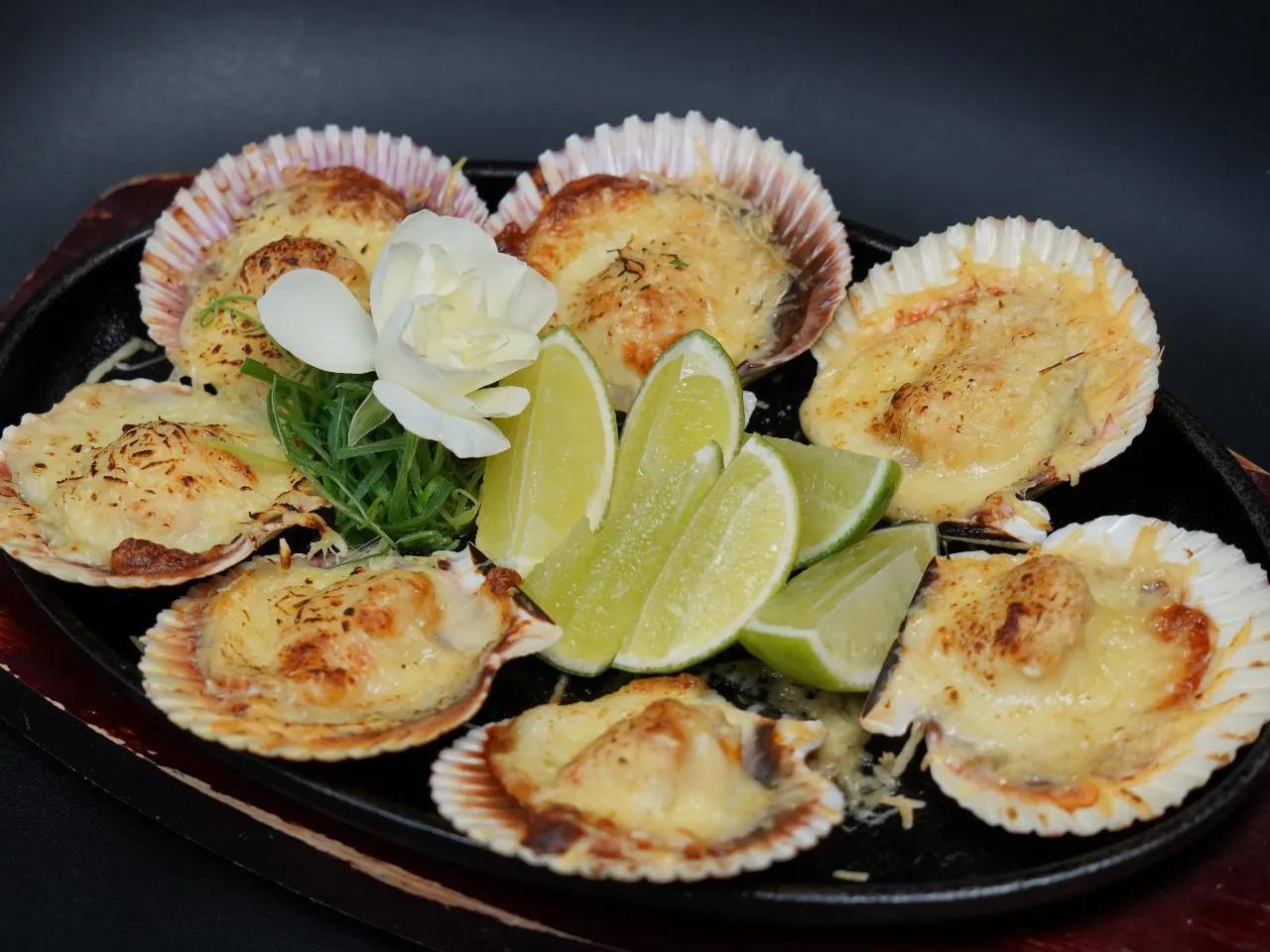 5 Ostiones en concha al natural y 5 Ostiones en concha a la parmesana. Acompañados de snacks y salsas.