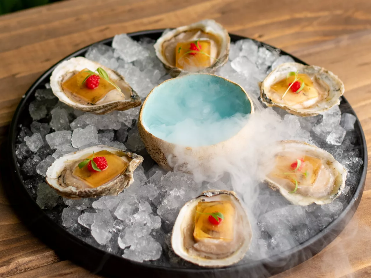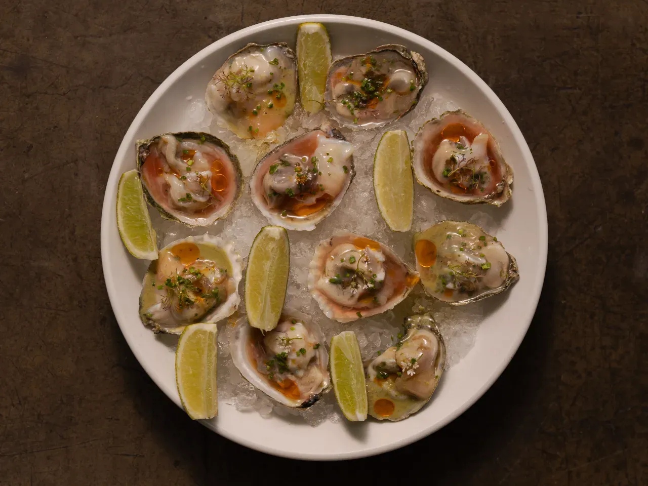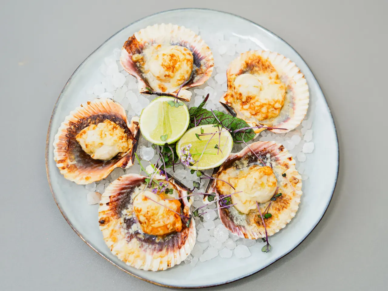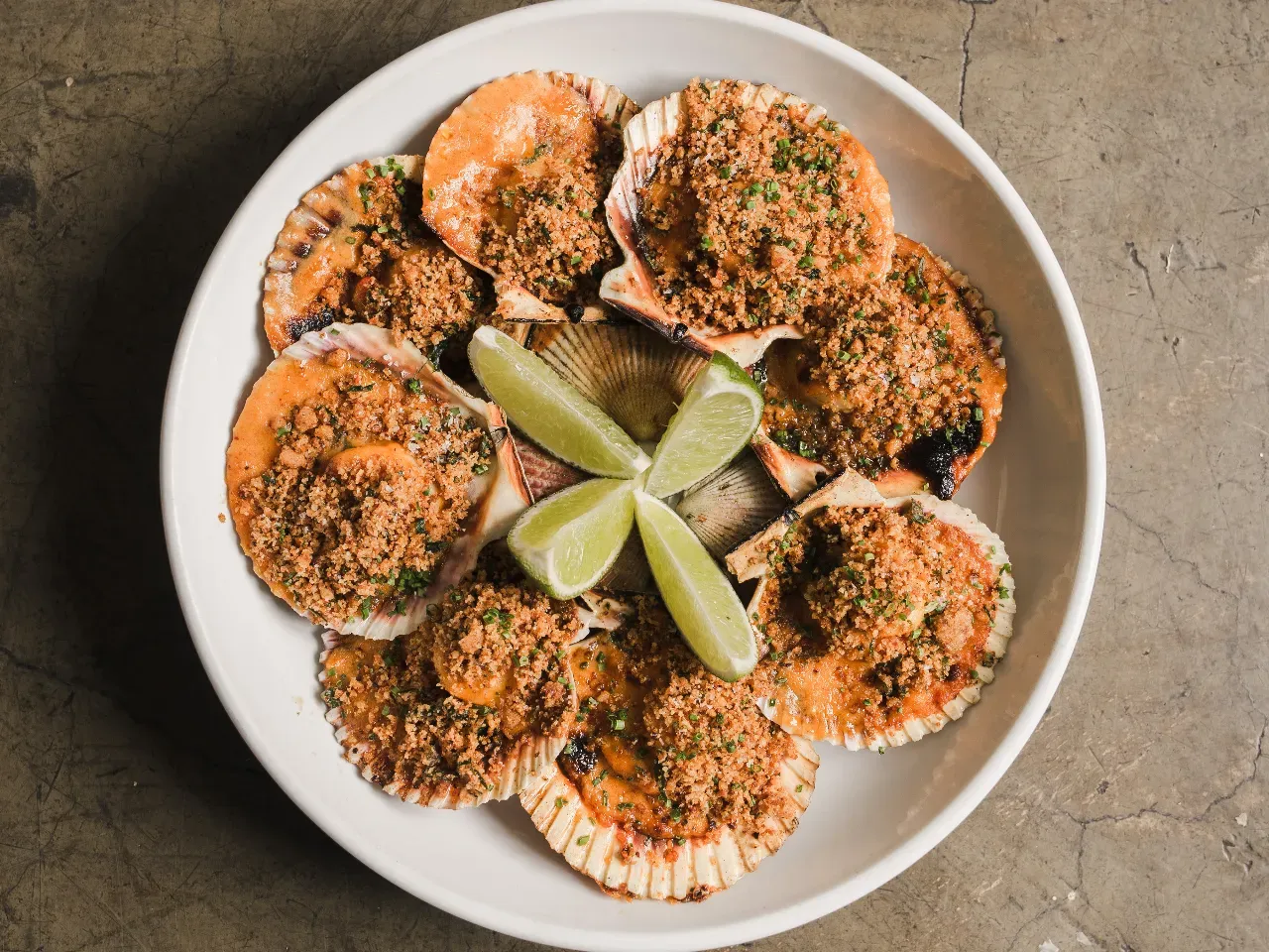 5 Ostiones en concha al natural y 5 Ostiones en concha a la parmesana. Acompañados de snacks y salsas.
