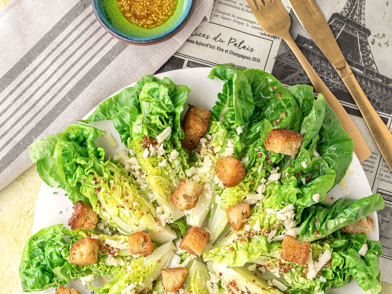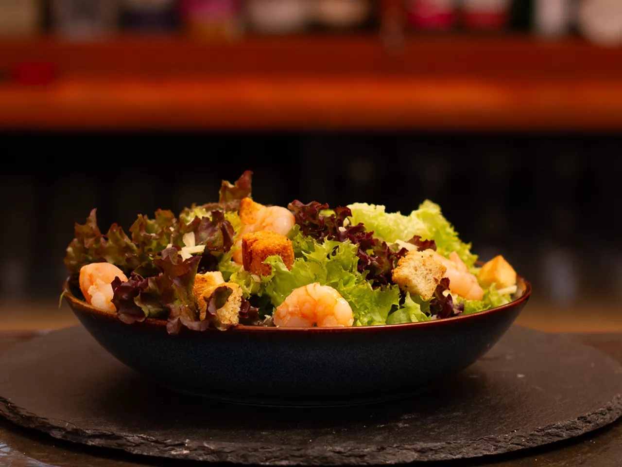 Clásica ensalada César, camarón, tostadas, queso parmesano y su tradicional dressing