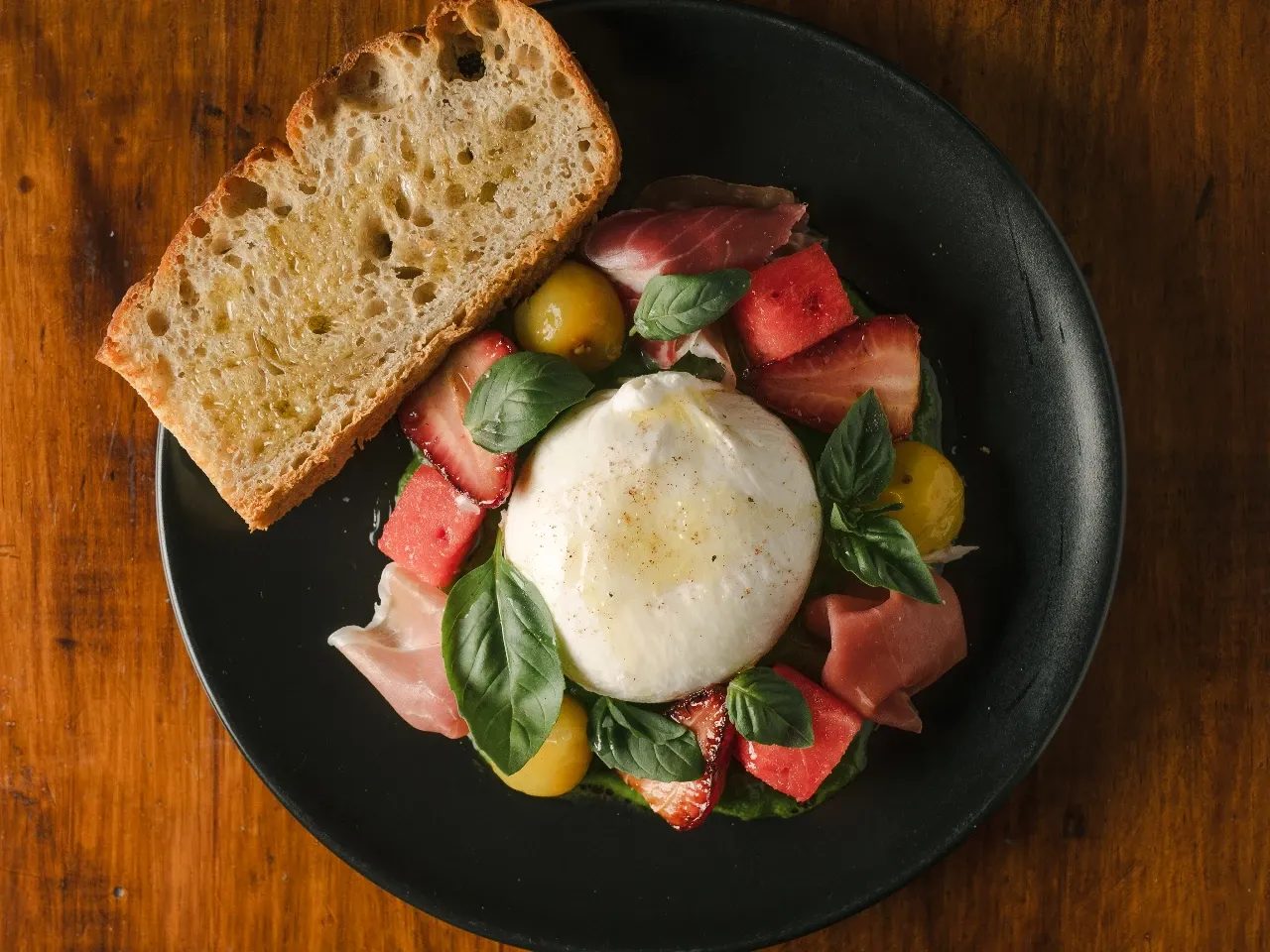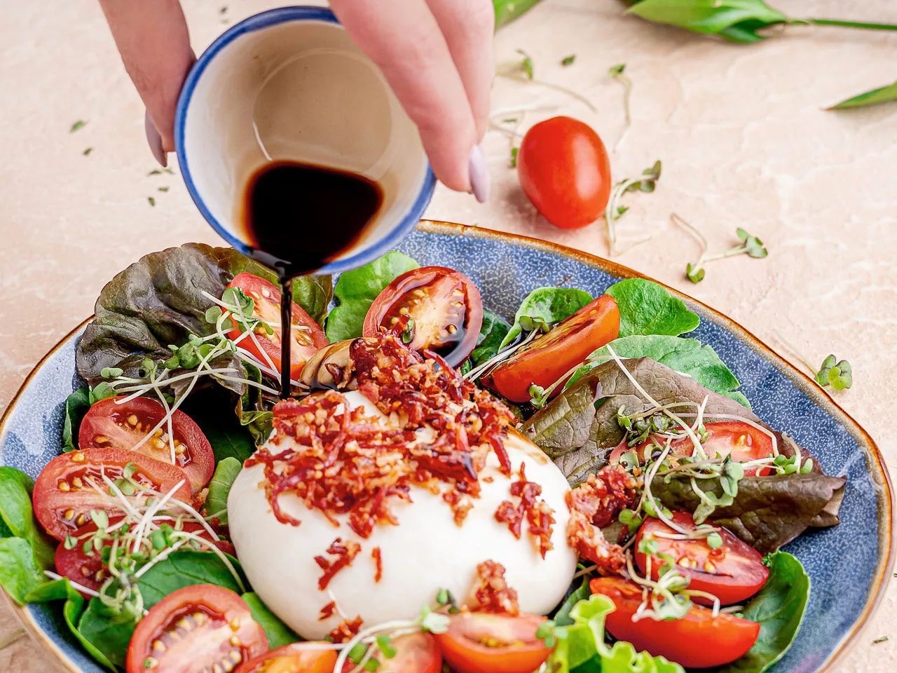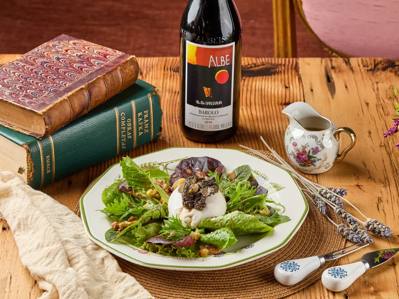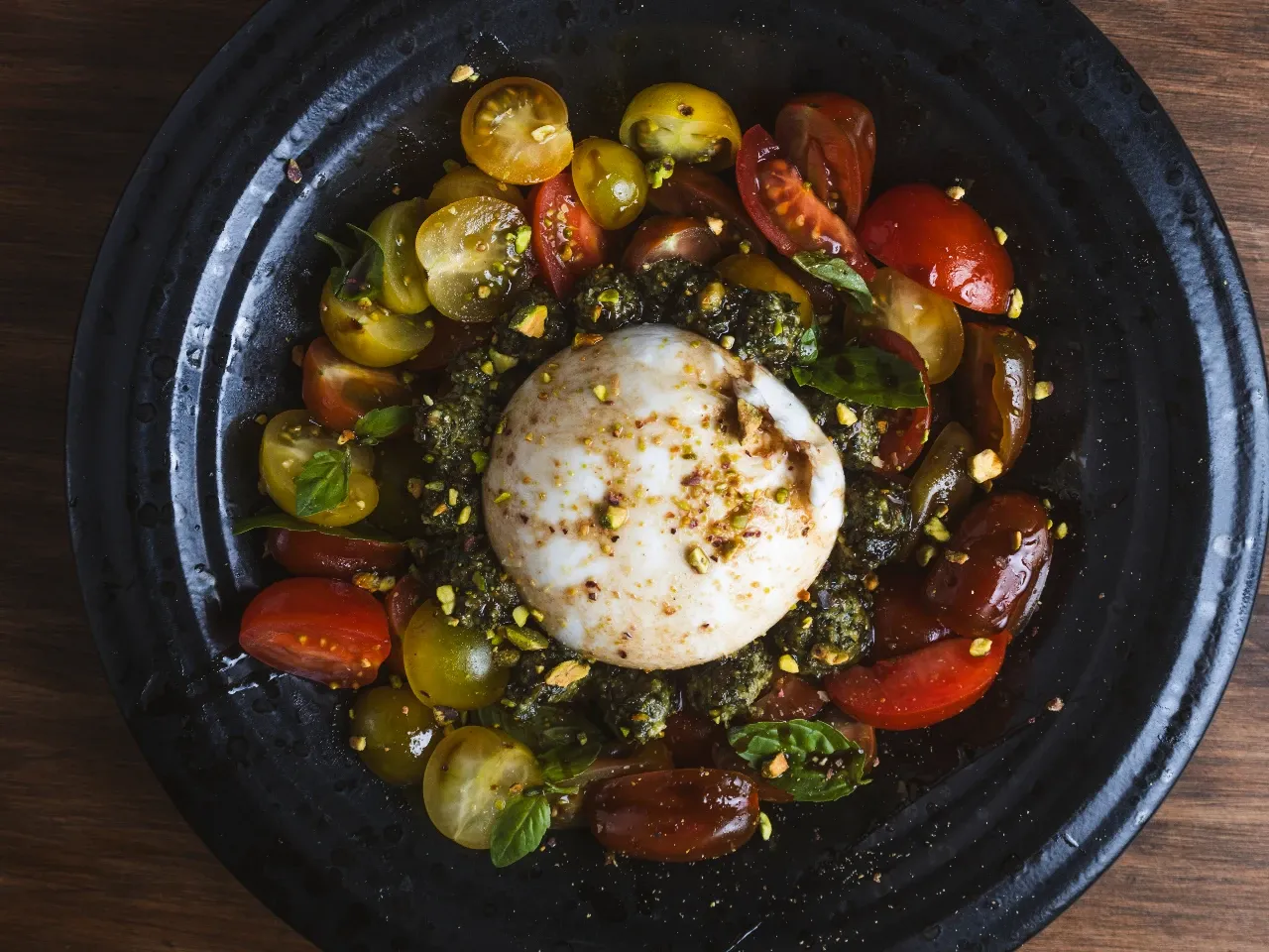 Burrata servida sobre una cama de mezclum orgánico fresco, acompañada de pecanas crujientes y una reducción de balsámico con un toque de aceite de trufa.