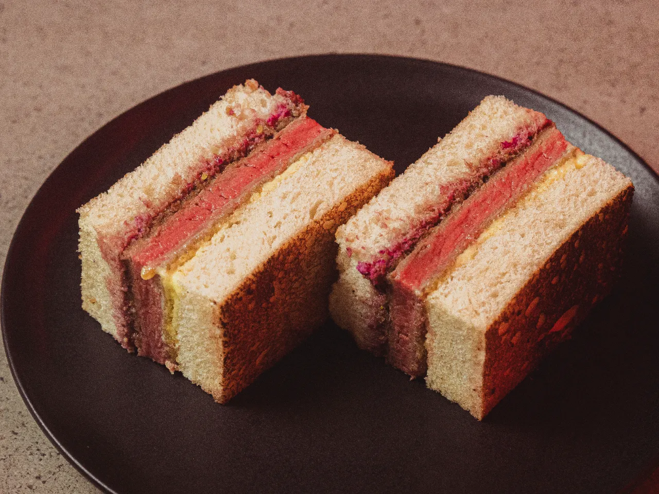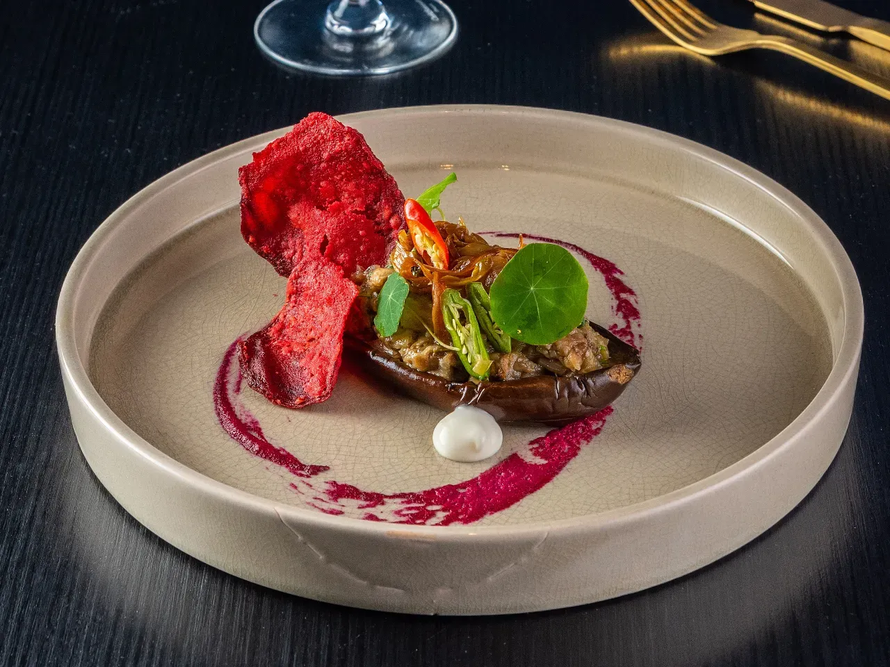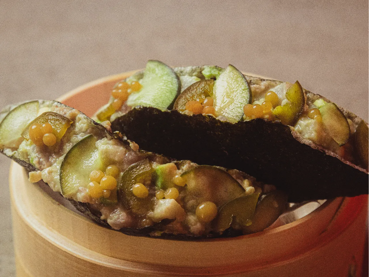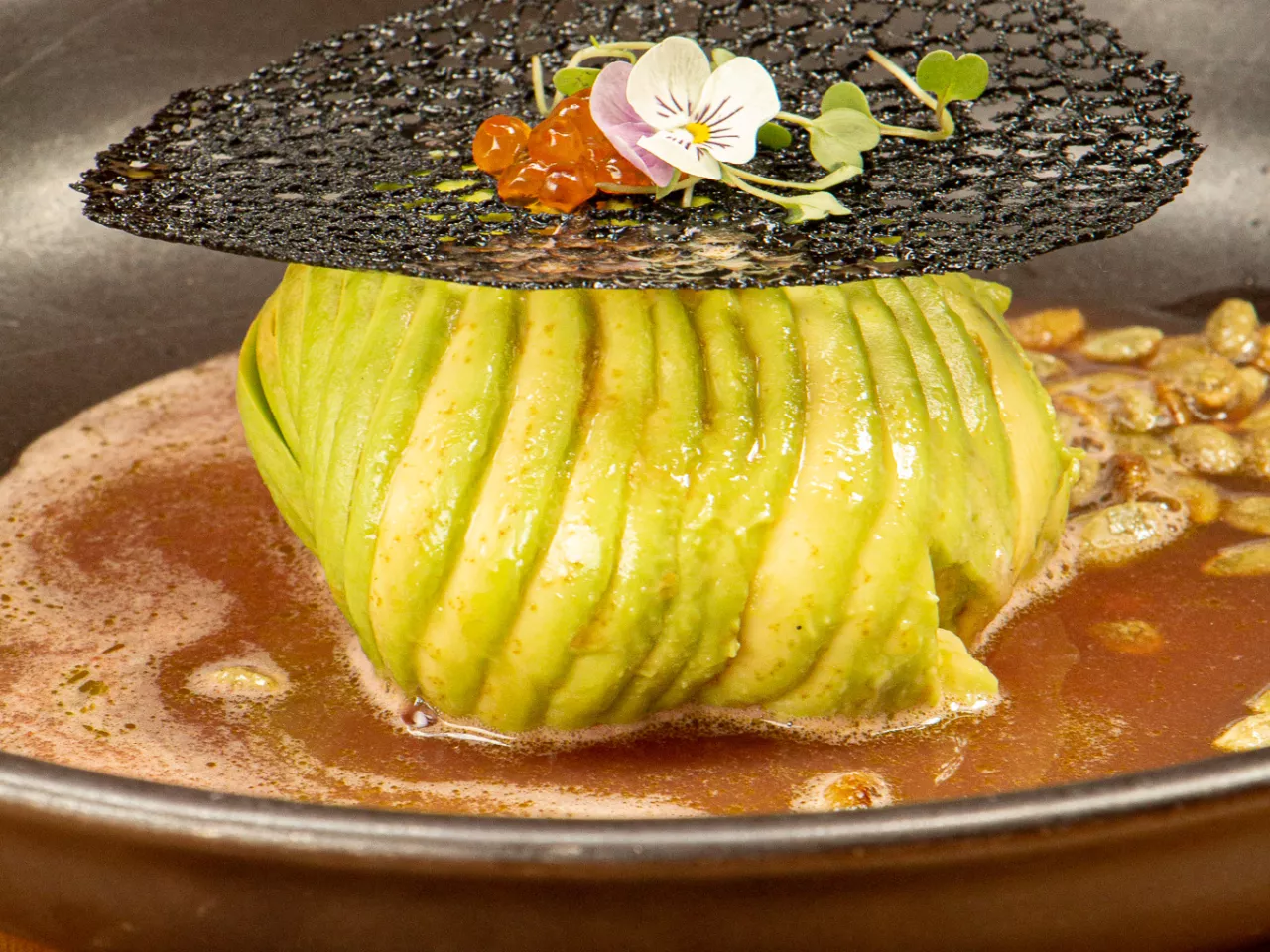 Tocineta y aroma de sésamo enrollado en aguacate, caldo de sandía picante, tuile de calamar, caviar y aceite de albahaca.