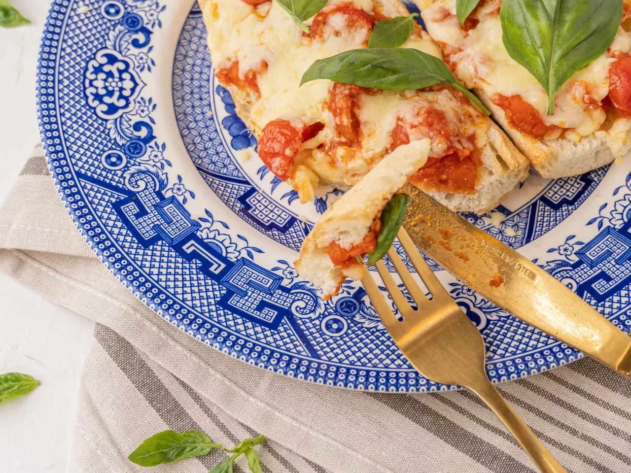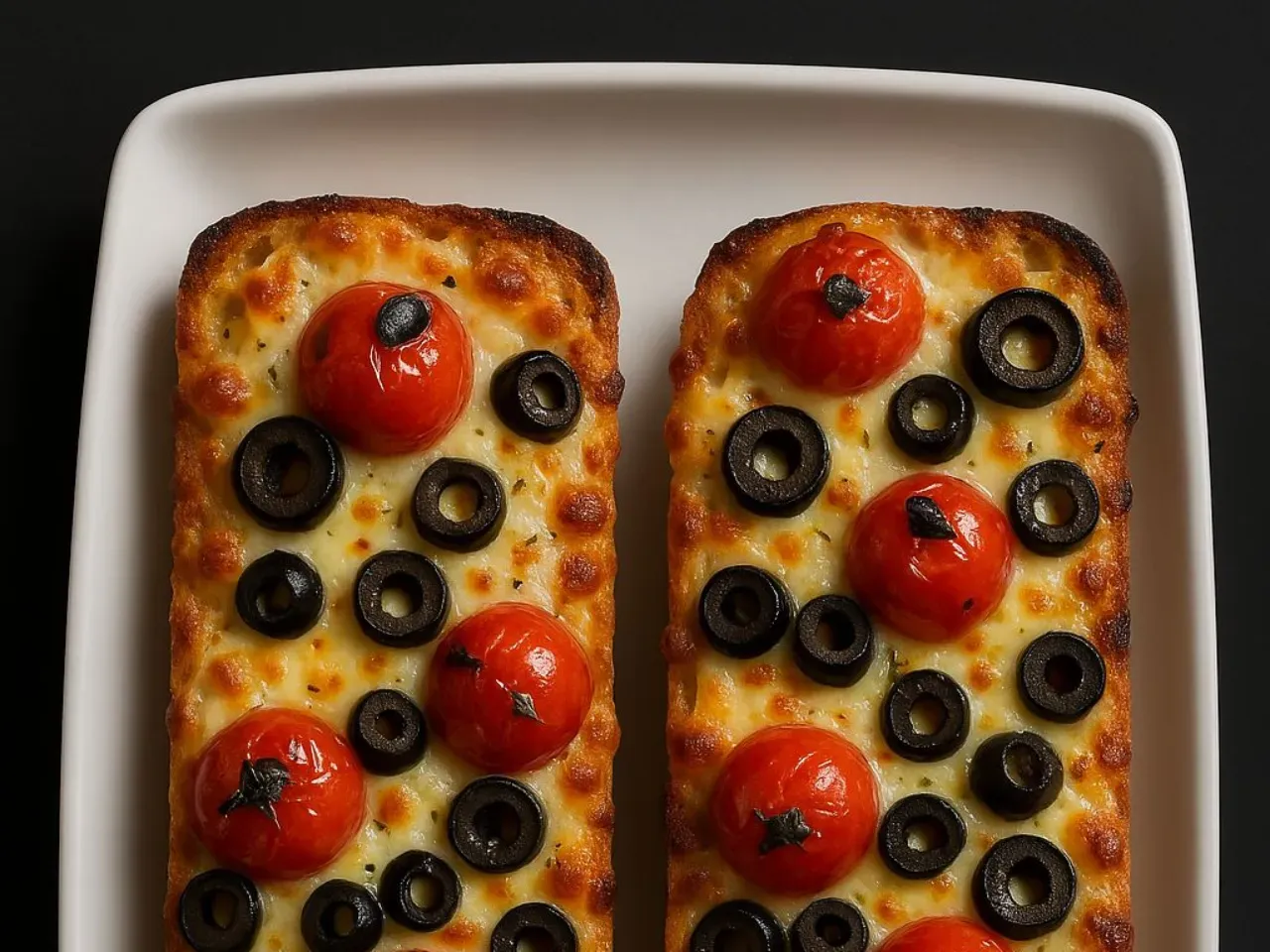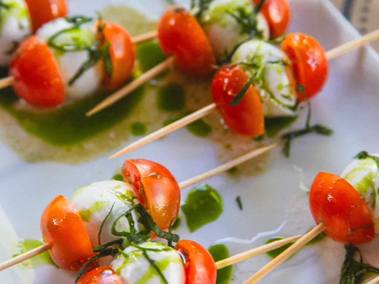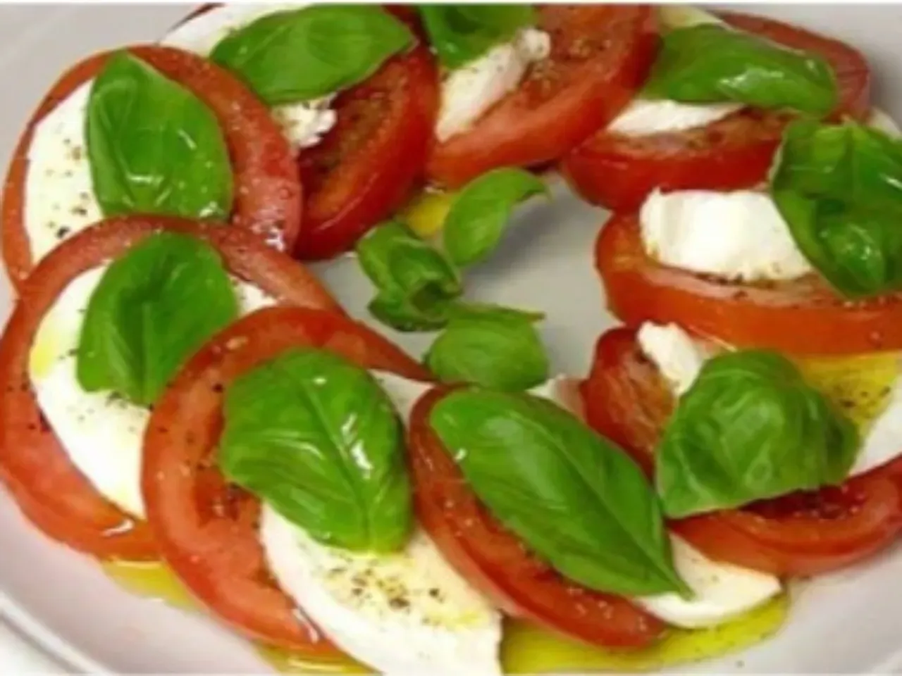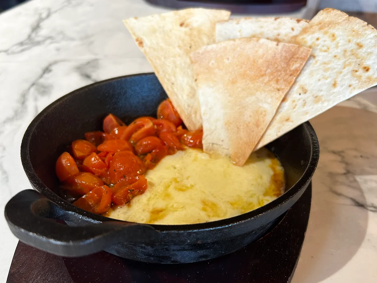Rodaja de tomate asado sobre queso provolone derretido a la parrilla, orégano y oliva.