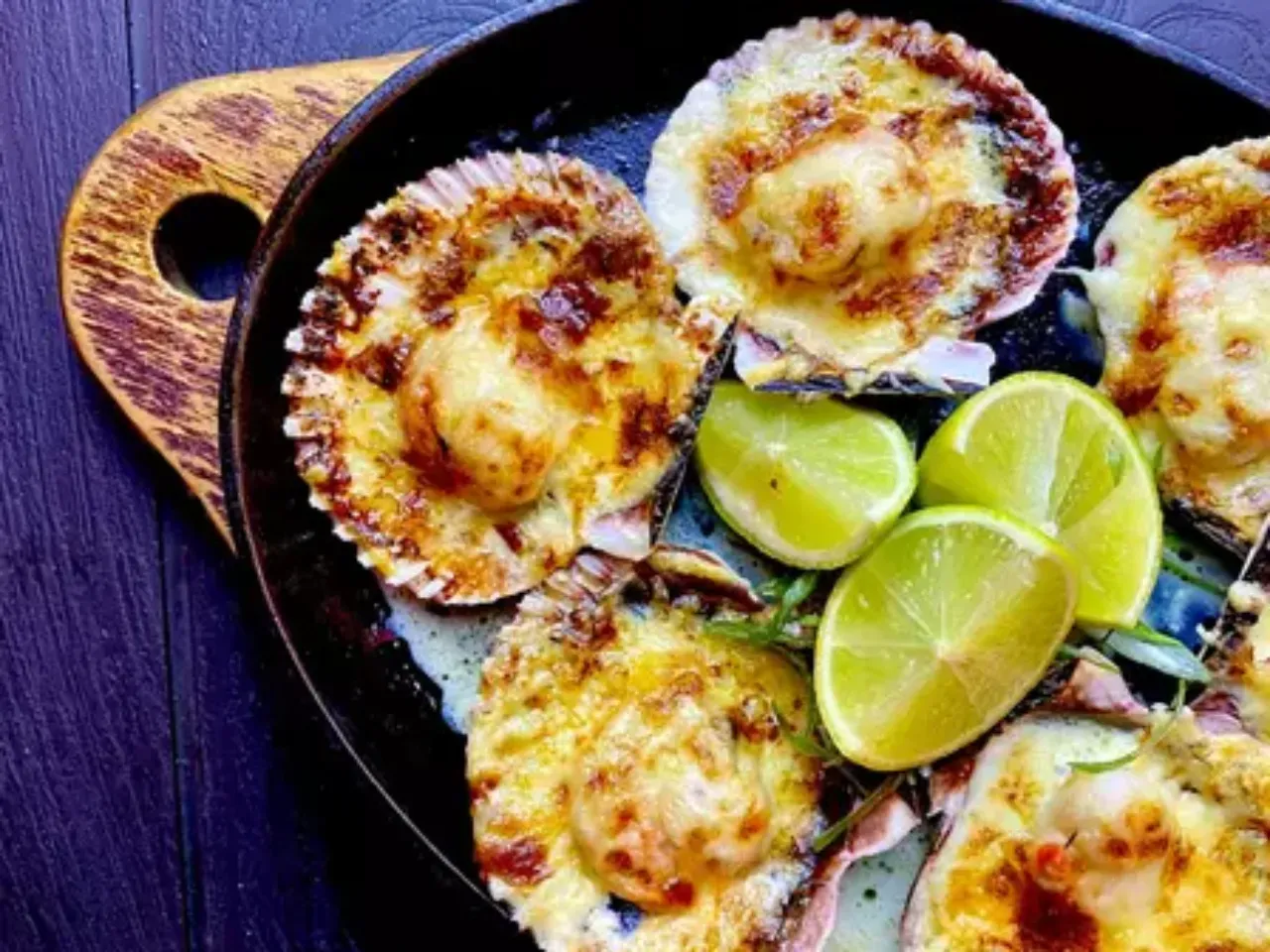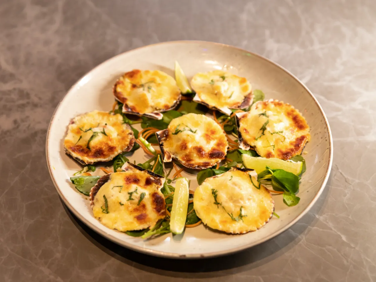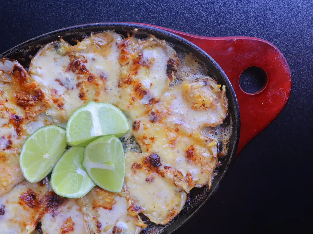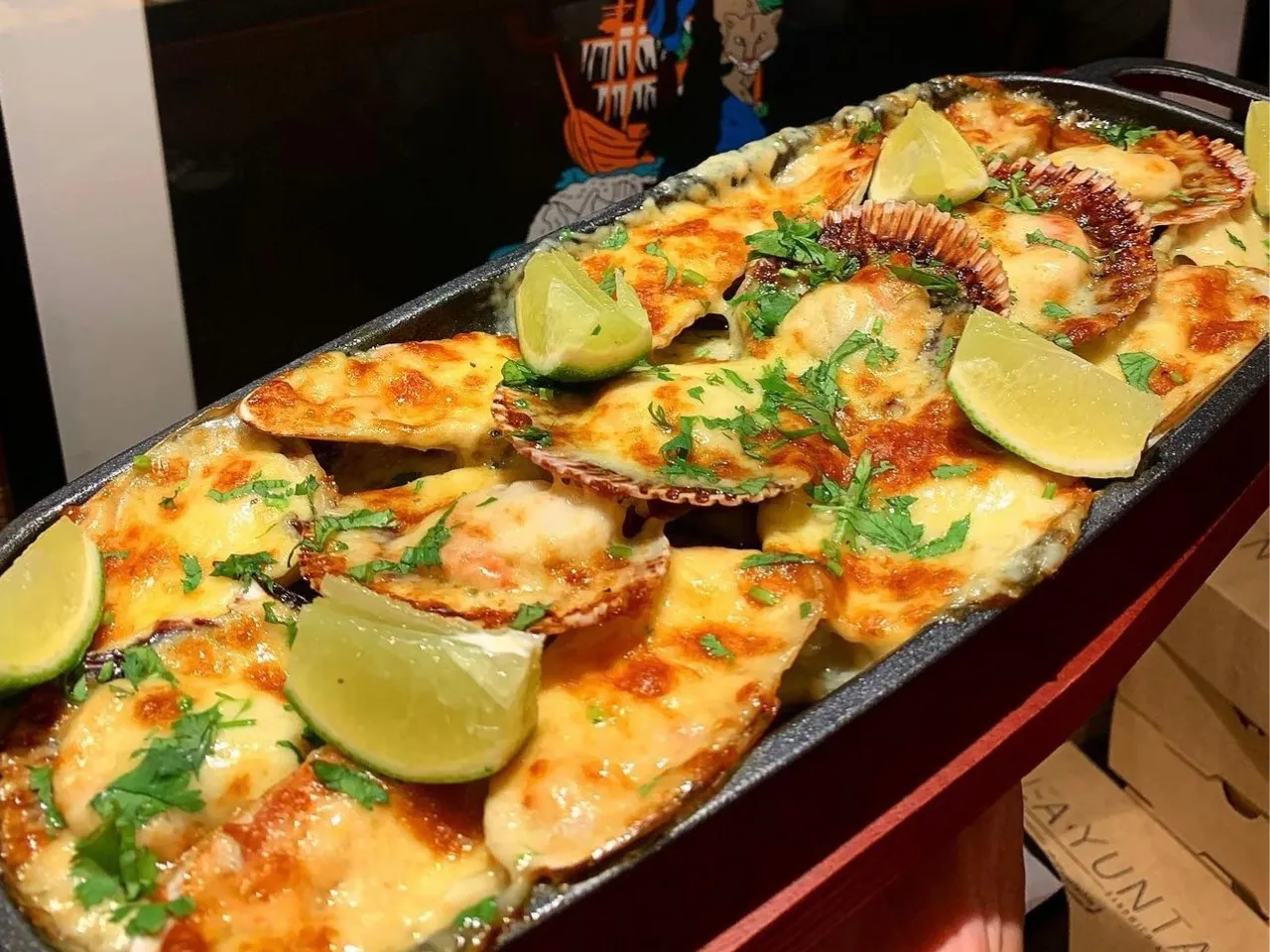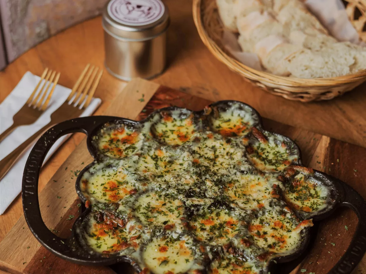 10 ostiones gratinados en queso parmesano queso de cabra y queso mantecoso acompañado con snacks y salsas.
