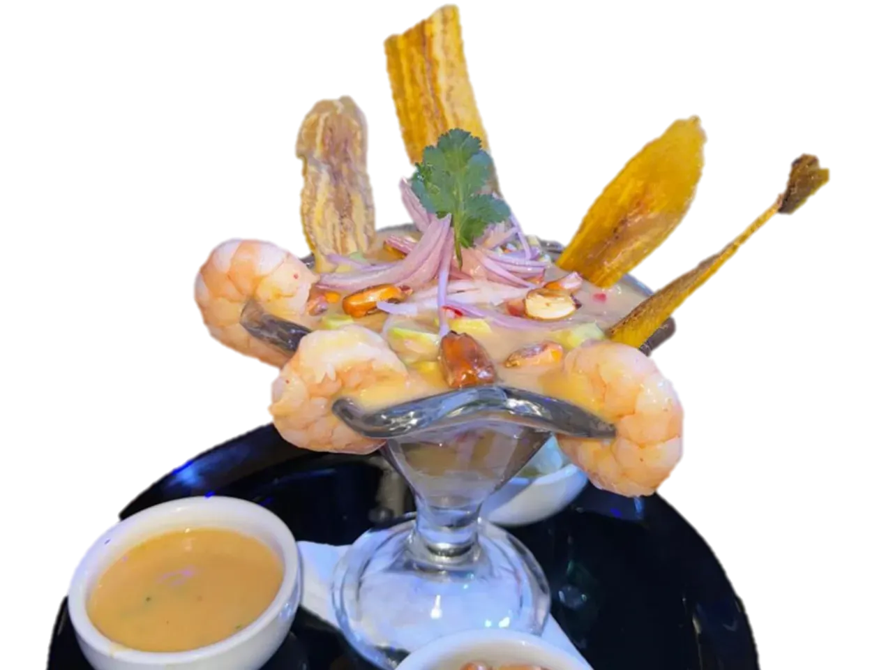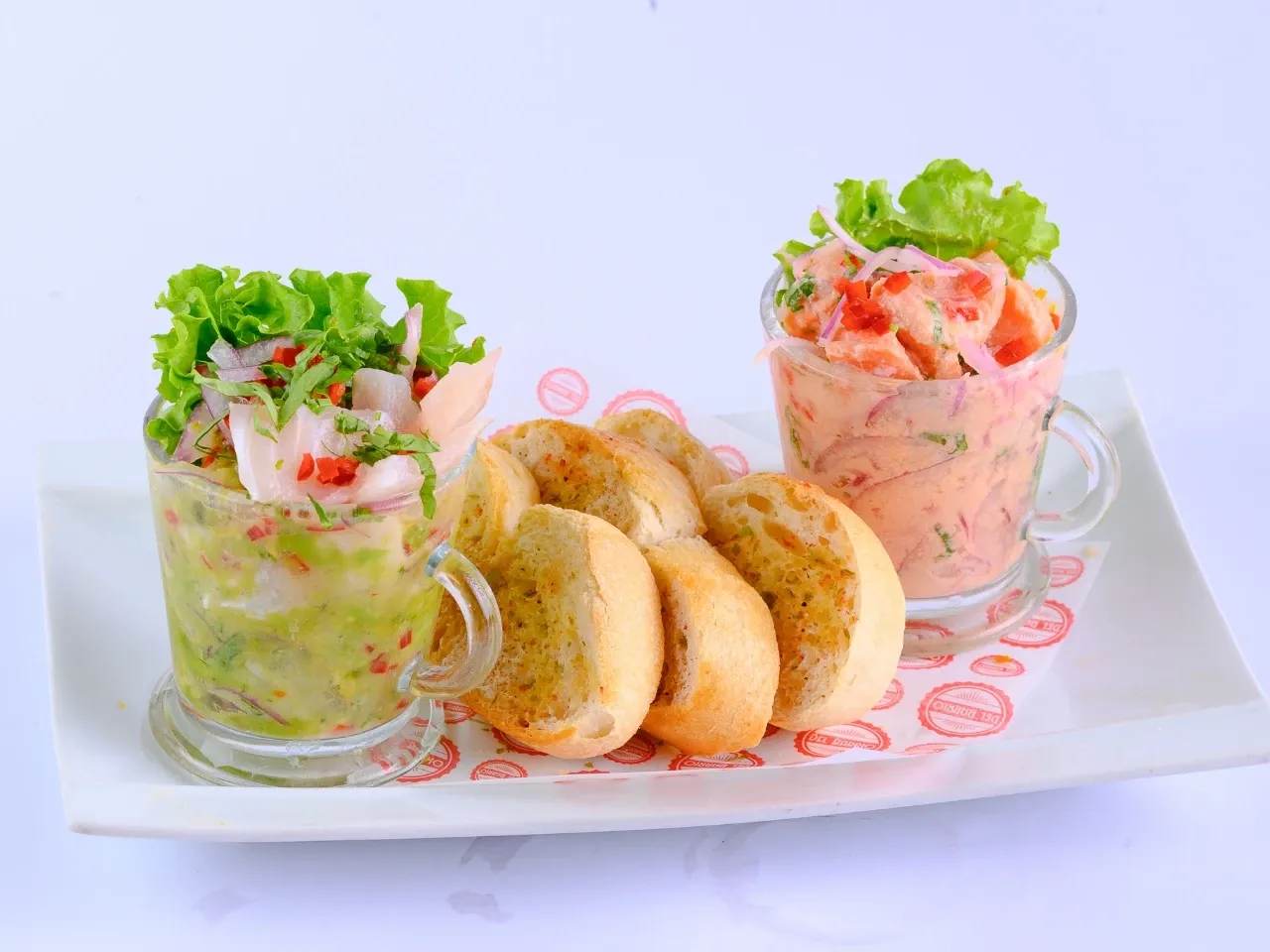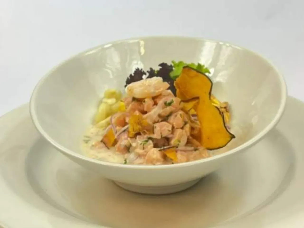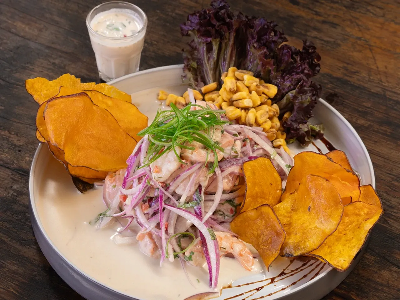 Trozos de salmón y camarón bañados en leche de tigre. Acompañado de chips de camote, choclo peruano y canchita crocante.