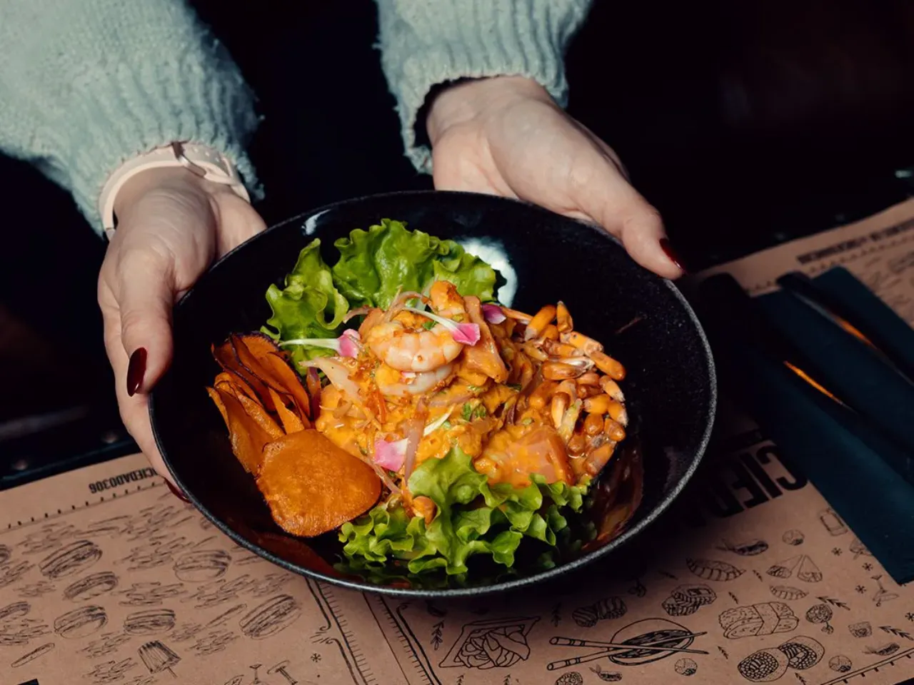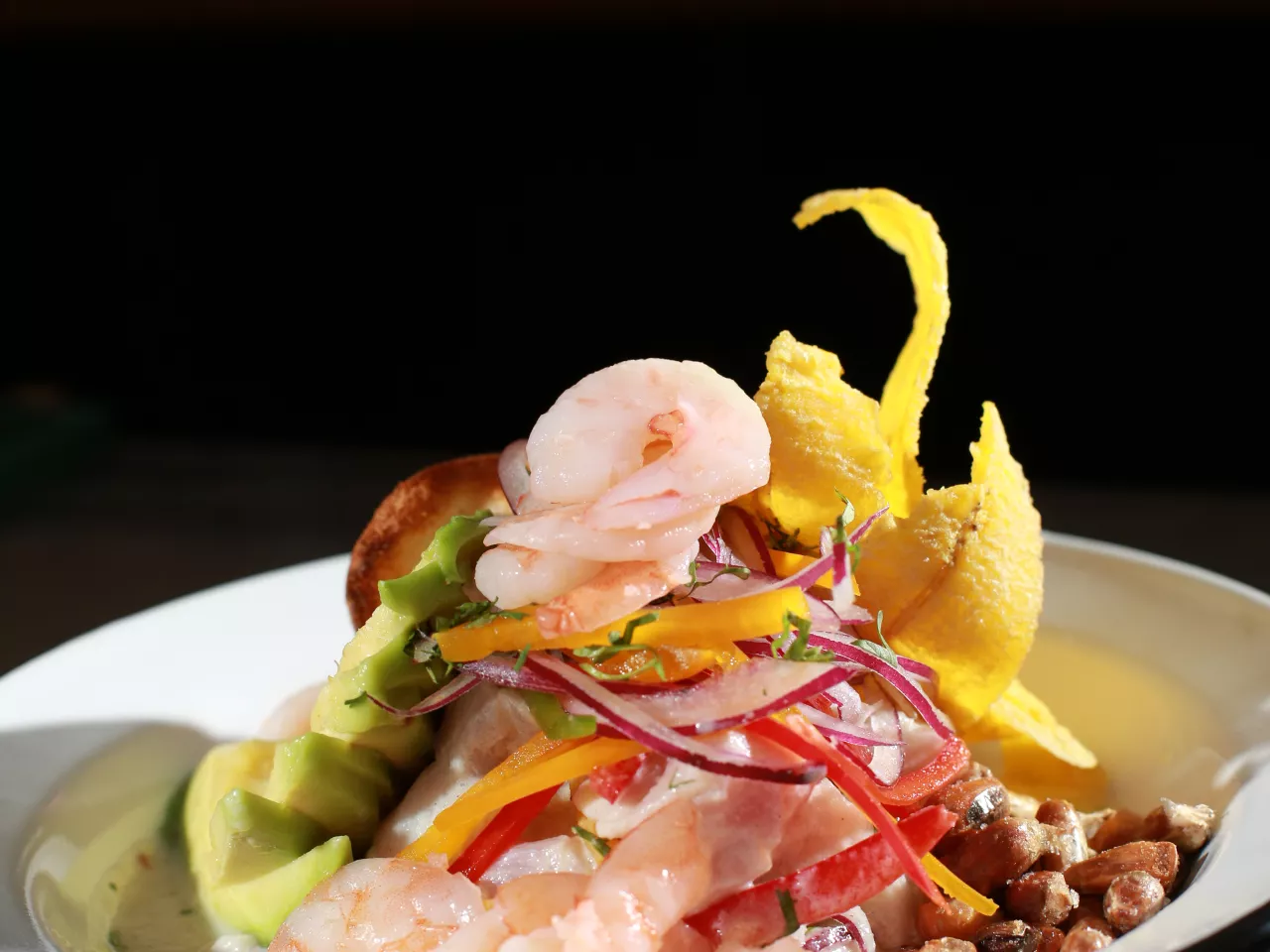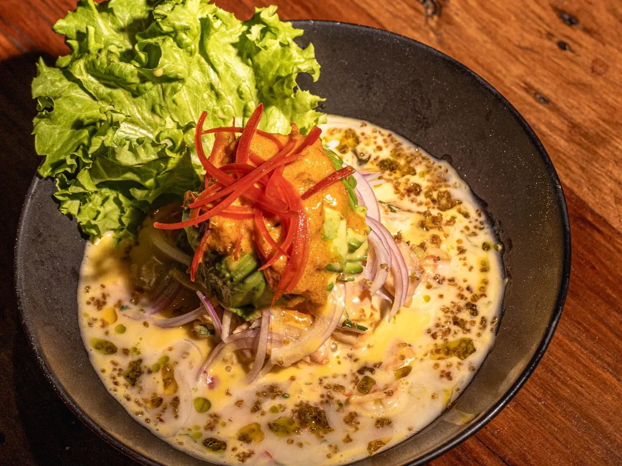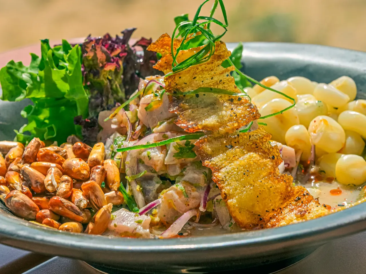 Trozos de salmón y camarón bañados en leche de tigre. Acompañado de chips de camote, choclo peruano y canchita crocante.