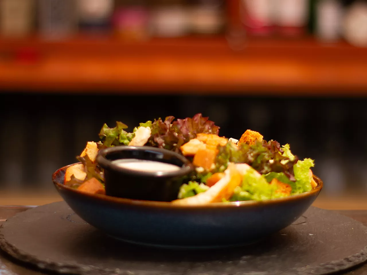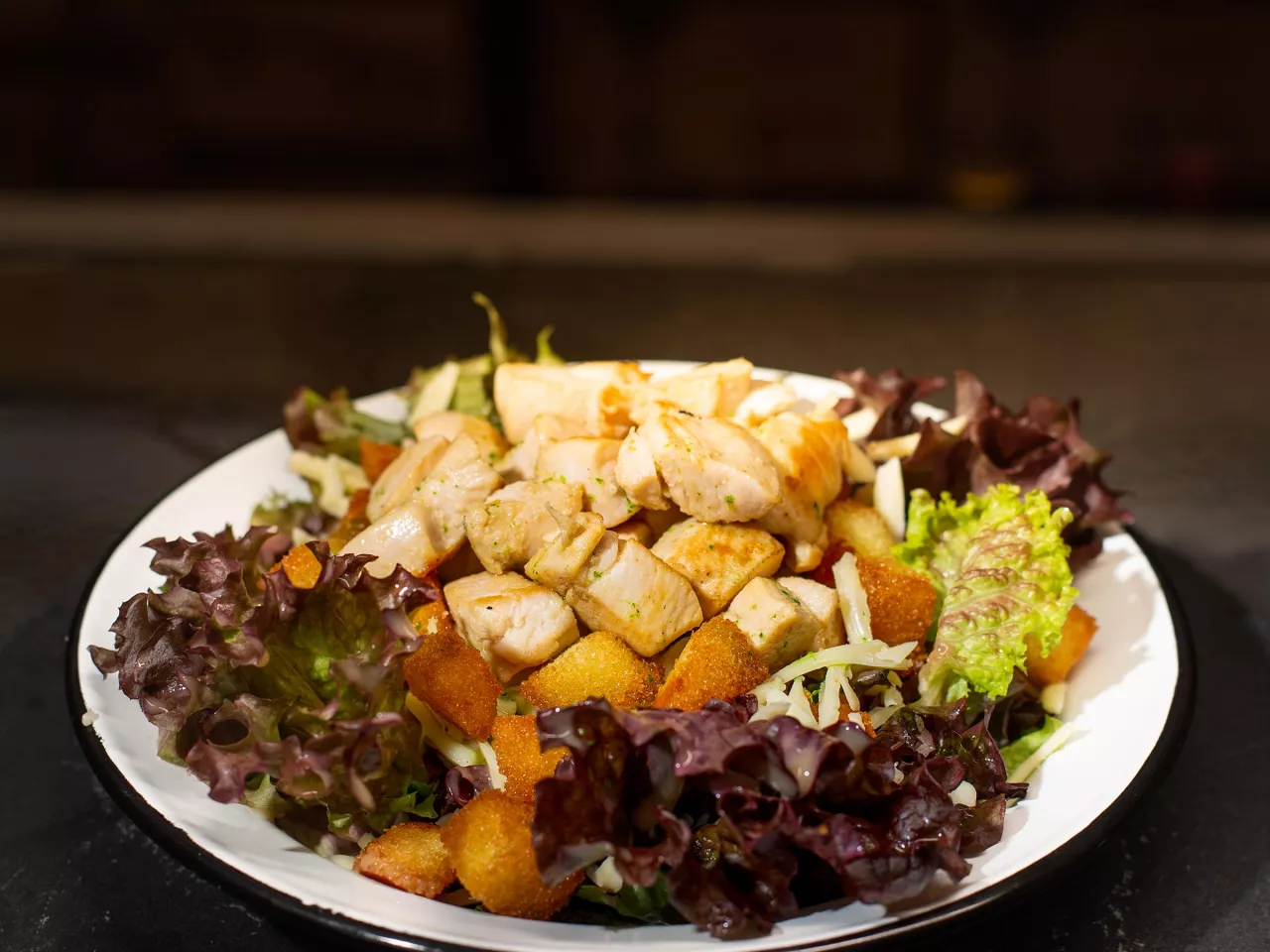 Mix de hojas verdes, parmesano, panceta ahumada, cherry, crton de la casa y bastones de ave