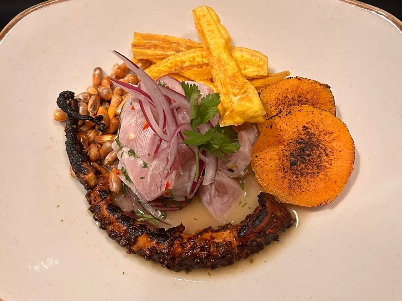 Mezcla de papas y camotes con pulpo a la parrilla, crema de aji amarillo, clorofila y brotes
