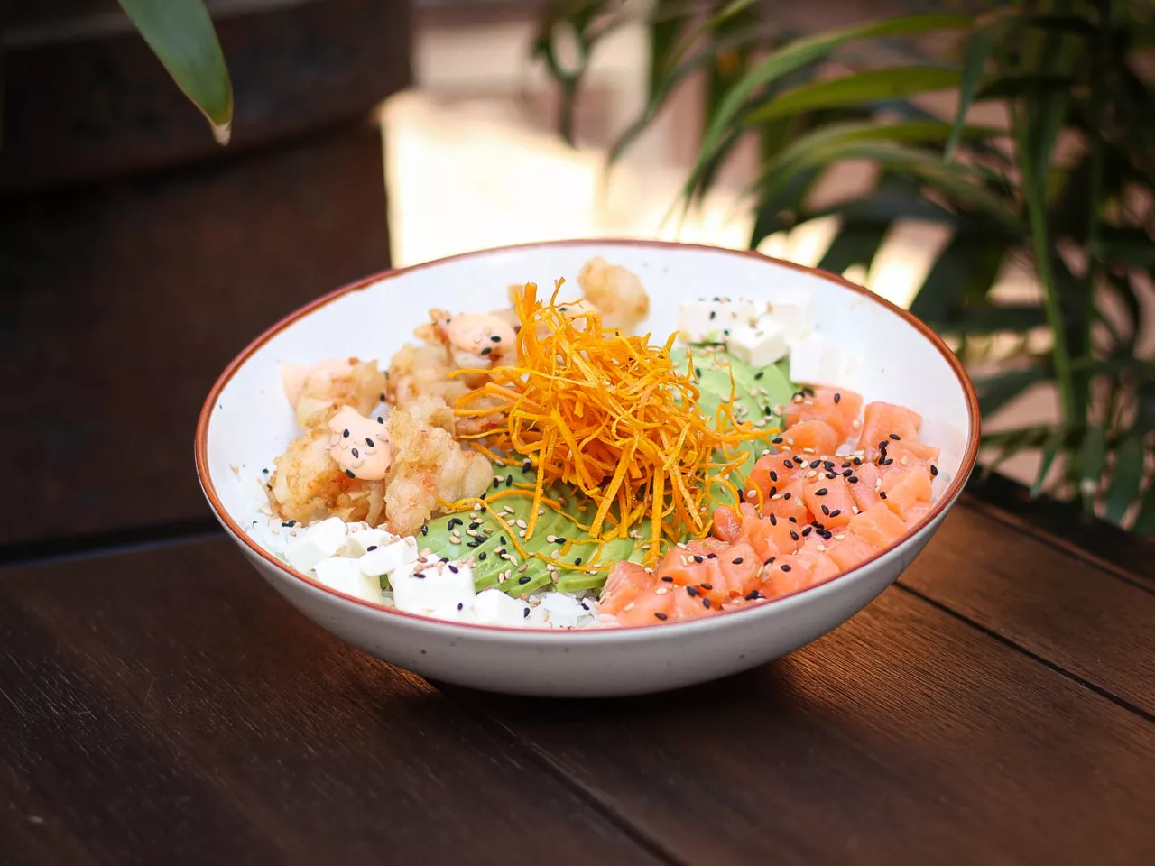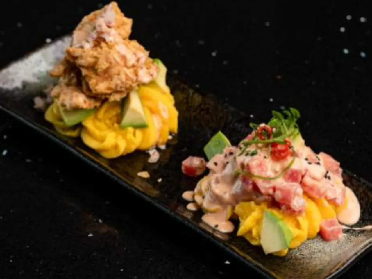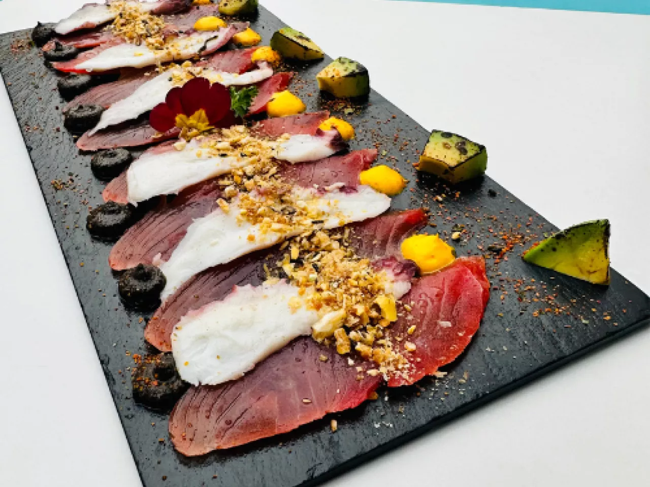 Finos cortes de salmón gravlax y pulpo en aliño nikkei, furikake, cubos de palta tataki salsa 2 olivos